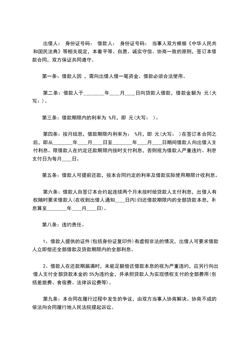 出借人: 身份证号码: 借款人: 身份证号码: 当事人双方根据《中华人民共和国民法典》等相关规定,本着平等、自愿、诚实守信、协商一致的原则,签订本借款合同,双方保证共同遵守。