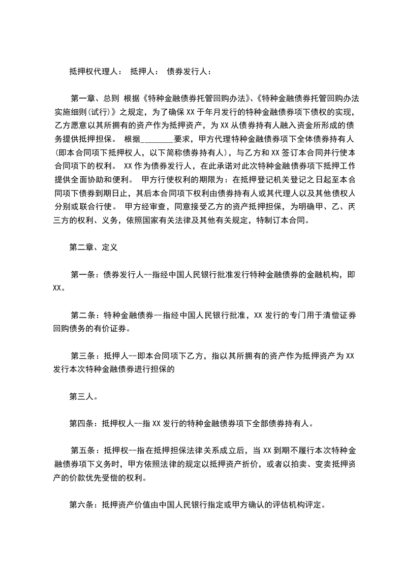 第一章、总则 根据《特种金融债券托管回购办法》、《特种金融债券托管回购办法实施细则(试行)》之规定,为了确保XX于年月发行的特种金融债券项下债权的实现,乙方愿意以其所拥有的资产作为抵押资产,为XX从债券持有人融入资金所形成的债务提供抵押担保。 根据________要求,甲方代理特种金融债券项下全体债券持有人(即本合同项下抵押权人,以下简称债券持有人),与乙方和XX签订本合同并行使本合同项下的权利。 XX作为债券发行人,在此承诺对此次特种金融债券项下抵押工作提供全面协助和便利。 甲方行使权利的期限为:在抵押登记机关登记之日起至本合同项下债券到期日止,其后本合同项下权利由债券持有人或其代理人以及其他债权人分别或联合行使。 甲方经审查,同意接受乙方的资产抵押担保,为明确甲、乙、丙三方的权利、义务,依照国家有关法律及其他有关规定,特制订本合同。