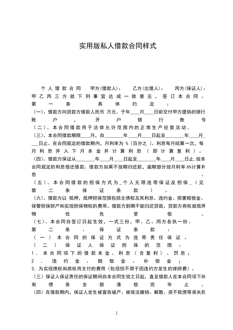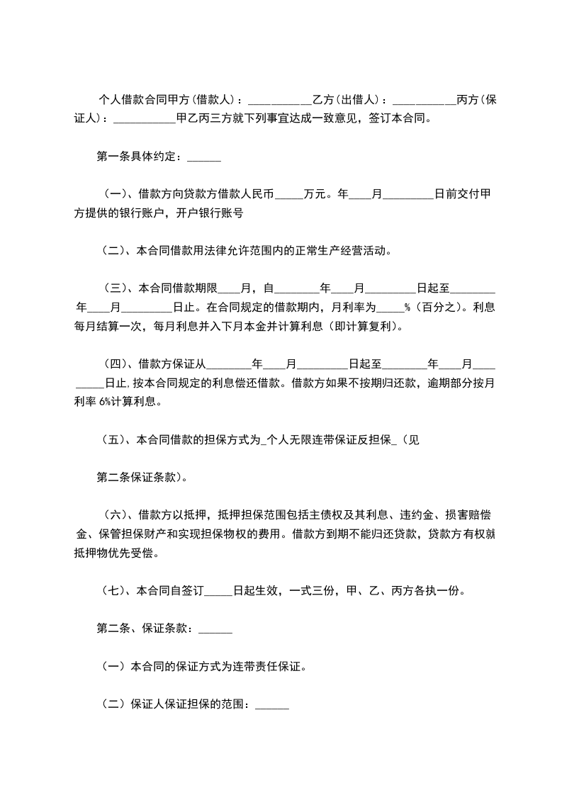 个 人 借 款 合 同 甲方(借款人): 乙方(出借人): 丙方(保证人): 甲乙丙三方就下列事宜达成一致意见,签订本合同。