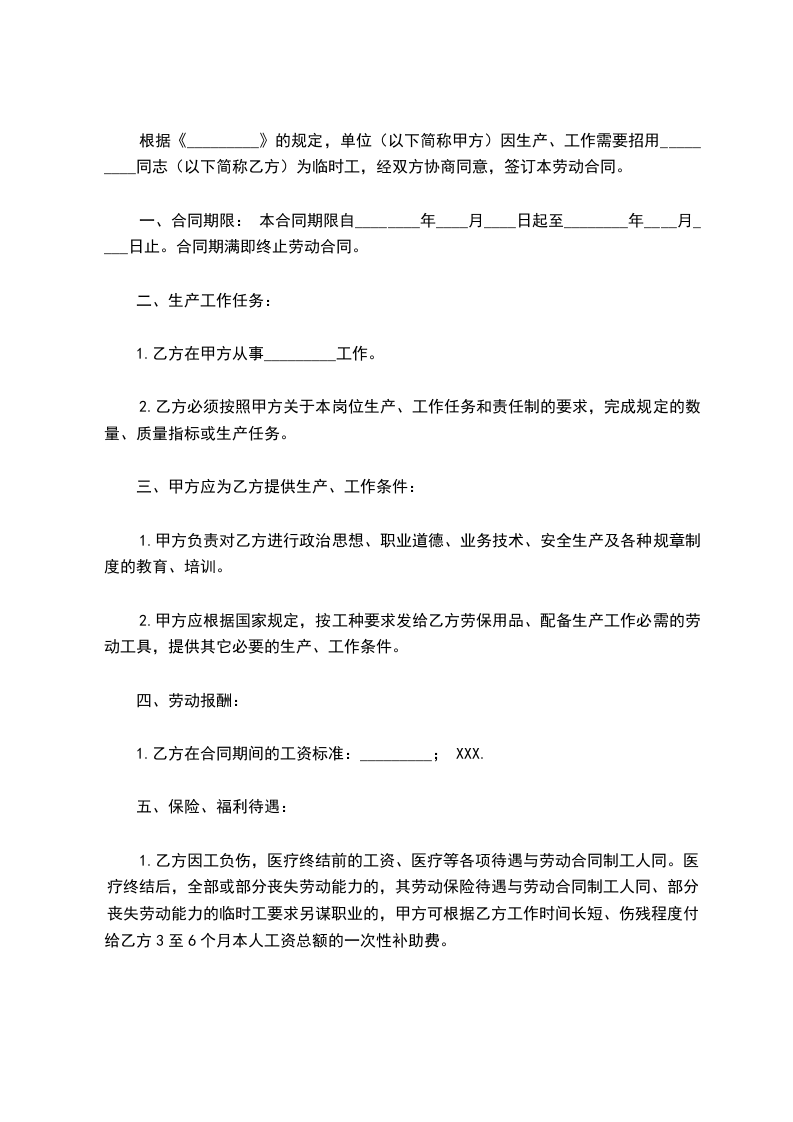 根据《_________》的规定,单位(以下简称甲方)因生产、工作需要招用_________同志(以下简称乙方)为临时工,经双方协商同意,签订本劳动合同。