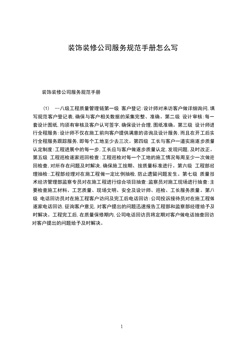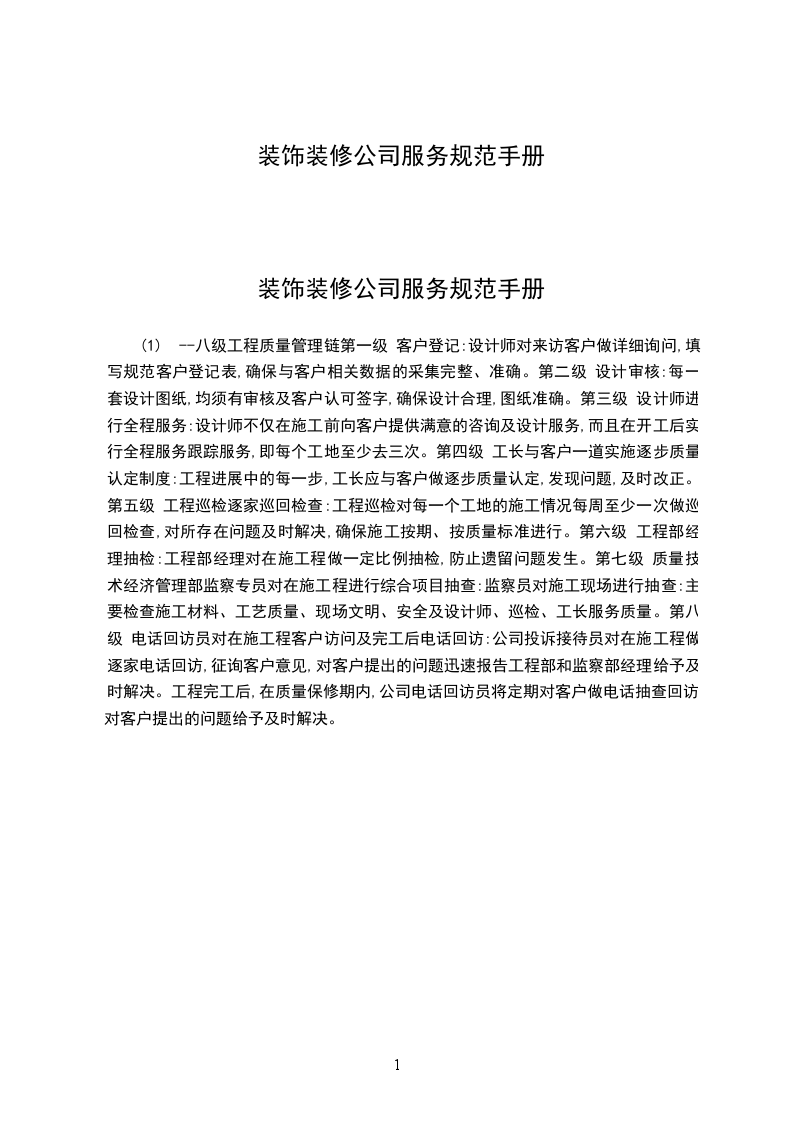 (1) --八级工程质量管理链第一级 客户登记:设计师对来访客户做详细询问,填写规范客户登记表,确保与客户相关数据的采集完整、准确。第二级 设计审核:每一套设计图纸,均须有审核及客户认可签字,确保设计合理,图纸准确。第三级 设计师进行全程服务:设计师不仅在施工前向客户提供满意的咨询及设计服务,而且在开工后实行全程服务跟踪服务,即每个工地至少去三次。第四级 工长与客户一道实施逐步质量认定制度:工程进展中的每一步,工长应与客户做逐步质量认定,发现问题,及时改正。第五级 工程巡检逐家巡回检查:工程巡检对每一个工地的施工情况每周至少一次做巡回检查,对所存在问题及时解决,确保施工按期、按质量标准进行。第六级 工程部经理抽检:工程部经理对在施工程做一定比例抽检,防止遗留问题发生。第七级 质量技术经济管理部监察专员对在施工程进行综合项目抽查:监察员对施工现场进行抽查:主要检查施工材料、工艺质量、现场文明、安全及设计师、巡检、工长服务质量。第八级 电话回访员对在施工程客户访问及完工后电话回访:公司投诉接待员对在施工程做逐家电话回访,征询客户意见,对客户提出的问题迅速报告工程部和监察部经理给予及时解决。工程完工后,在质量保修期内,公司电话回访员将定期对客户做电话抽查回访,对客户提出的问题给予及时解决。