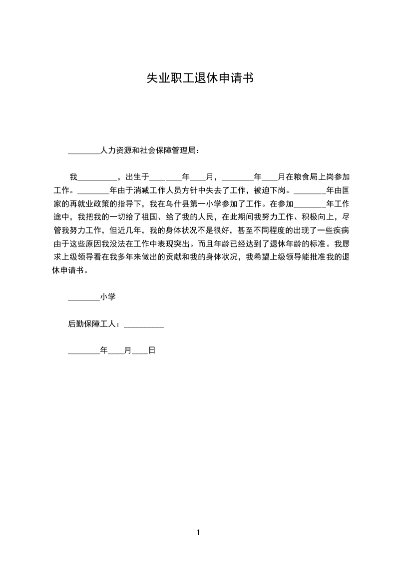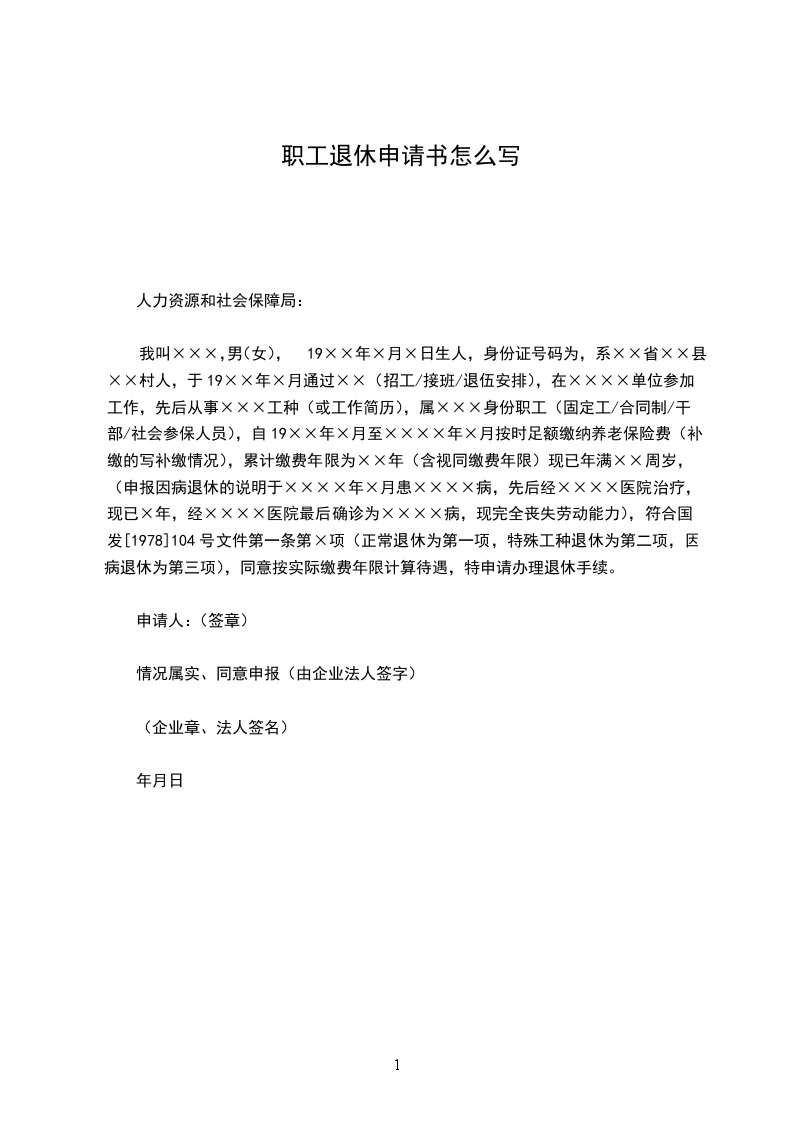 我叫×××,男(女),19××年×月×日生人,身份证号码为,系××省××县××村人,于19××年×月通过××(招工/接班/退伍安排),在××××单位参加工作,先后从事×××工种(或工作简历),属×××身份职工(固定工/合同制/干部/社会参保人员),自19××年×月至××××年×月按时足额缴纳养老保险费(补缴的写补缴情况),累计缴费年限为××年(含视同缴费年限)现已年满××周岁,(申报因病退休的说明于××××年×月患××××病,先后经××××医院治疗,现已×年,经××××医院最后确诊为××××病,现完全丧失劳动能力),符合国发[1978]104号文件第一条第×项(正常退休为第一项,特殊工种退休为第二项,因病退休为第三项),同意按实际缴费年限计算待遇,特申请办理退休手续。