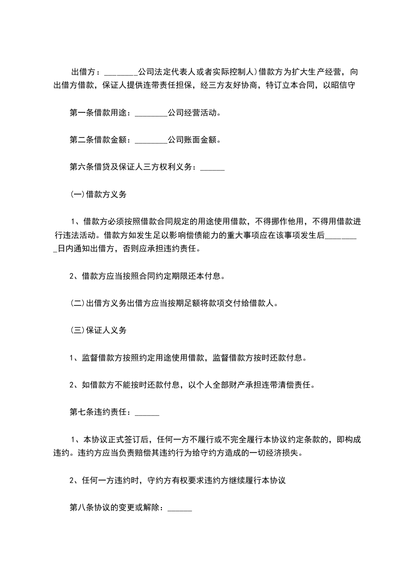 一. 甲方同意无息借款给乙方,作为生产经营流动资金。