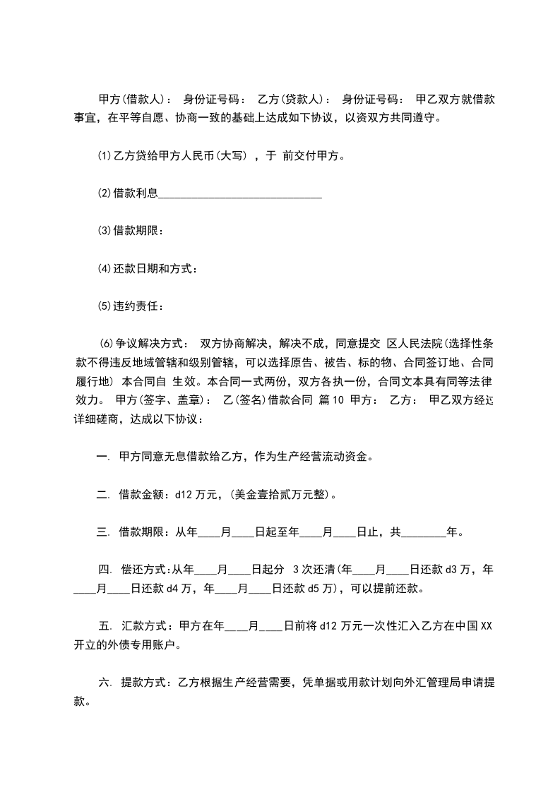 (6)争议解决方式: 双方协商解决,解决不成,同意提交 区人民法院(选择性条款不得违反地域管辖和级别管辖,可以选择原告、被告、标的物、合同签订地、合同履行地) 本合同自 生效。本合同一式两份,双方各执一份,合同文本具有同等法律效力。 甲方(签字、盖章): 乙(签名)借款合同 篇10 甲方: 乙方: 甲乙双方经过详细磋商,达成以下协议: