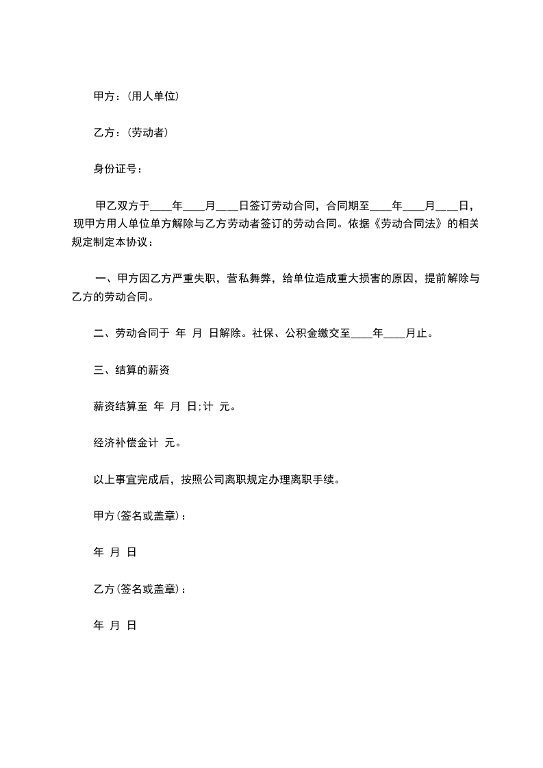 一、甲方因乙方严重失职,营私舞弊,给单位造成重大损害的原因,提前解除与乙方的劳动合同。
