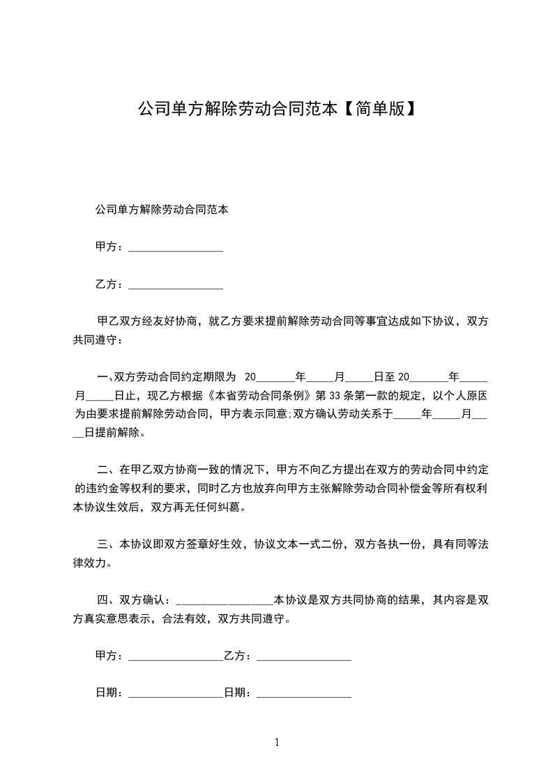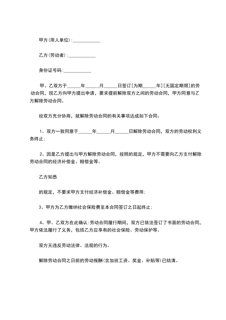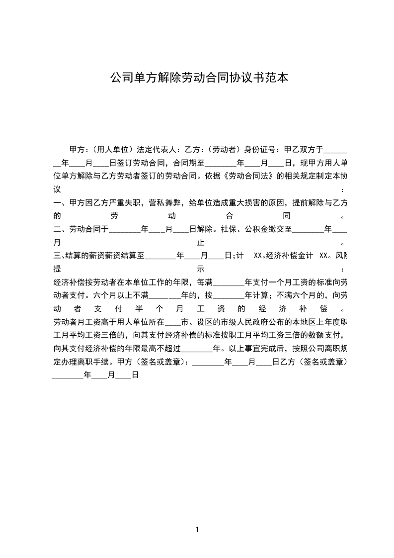 甲方:(用人单位)法定代表人:乙方:(劳动者)身份证号:甲乙双方于________年____月____日签订劳动合同,合同期至________年____月____日,现甲方用人单位单方解除与乙方劳动者签订的劳动合同。依据《劳动合同法》的相关规定制定本协议: