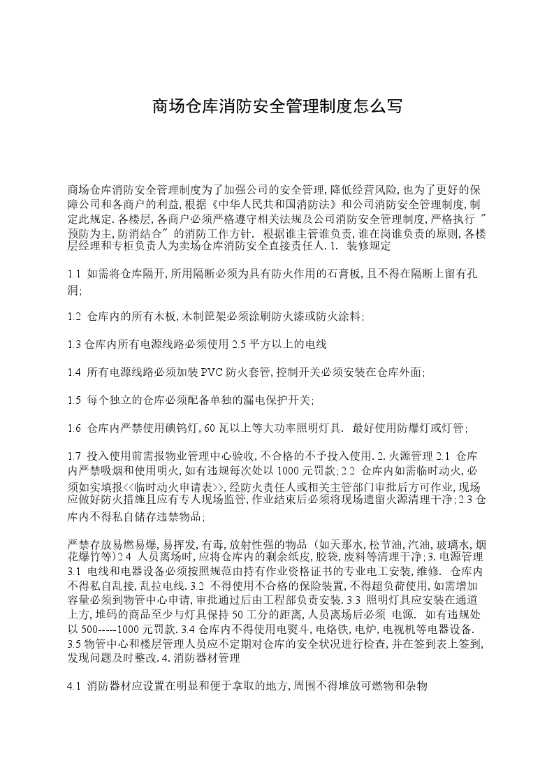 商场仓库消防安全管理制度为了加强公司的安全管理,降低经营风险,也为了更好的保障公司和各商户的利益,根据《中华人民共和国消防法》和公司消防安全管理制度,制定此规定.各楼层,各商户必须严格遵守相关法规及公司消防安全管理制度,严格执行 "预防为主,防消结合" 的消防工作方针. 根据谁主管谁负责,谁在岗谁负责的原则,各楼层经理和专柜负责人为卖场仓库消防安全直接责任人.1. 装修规定
