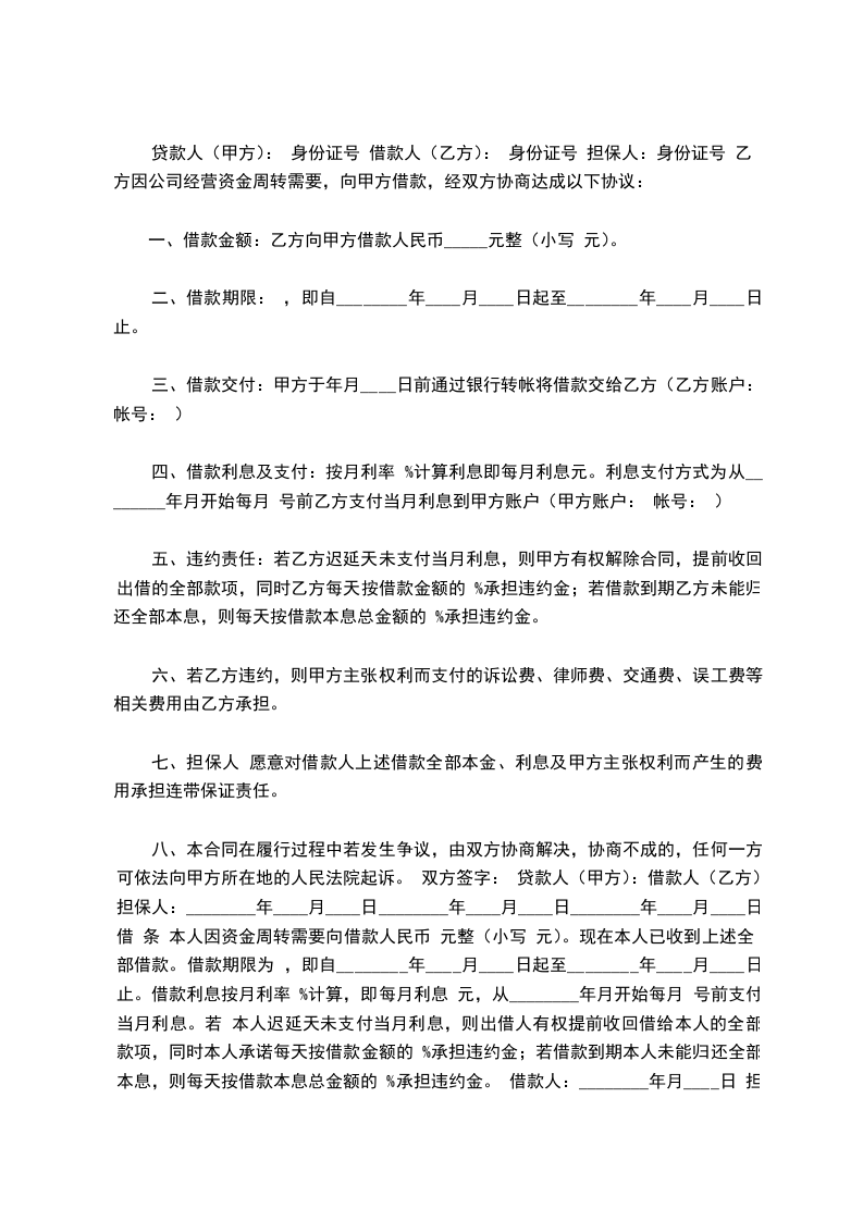 贷款人(甲方): 身份证号 借款人(乙方): 身份证号 担保人:身份证号 乙方因公司经营资金周转需要,向甲方借款,经双方协商达成以下协议: