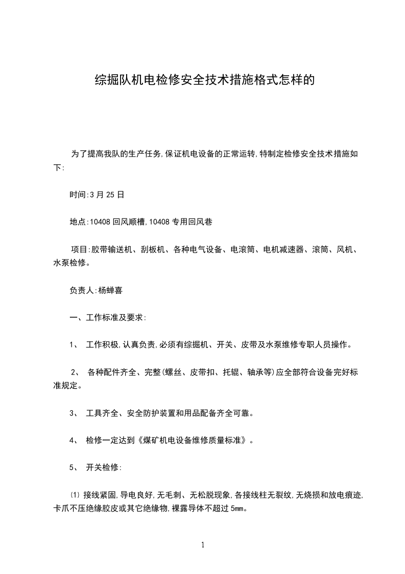 为了提高我队的生产任务,保证机电设备的正常运转,特制定检修安全技术措施如下: