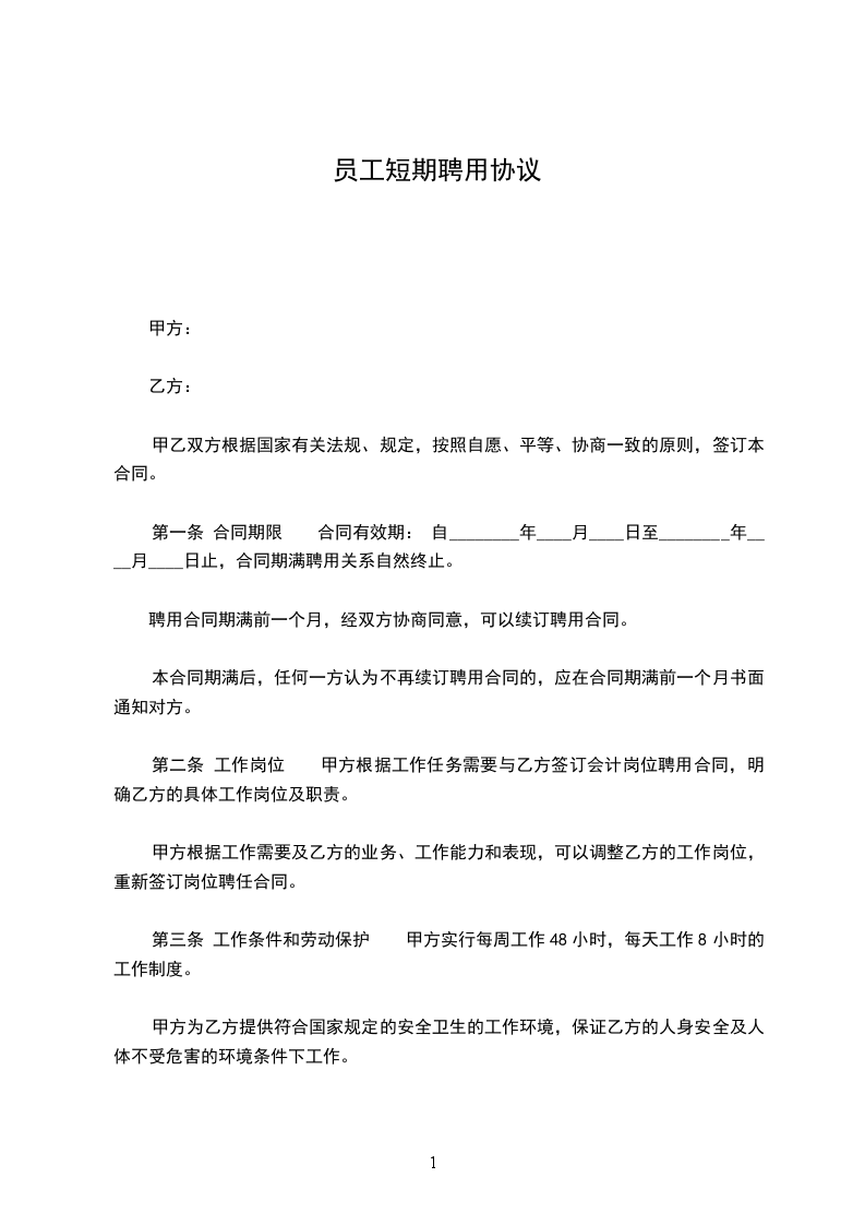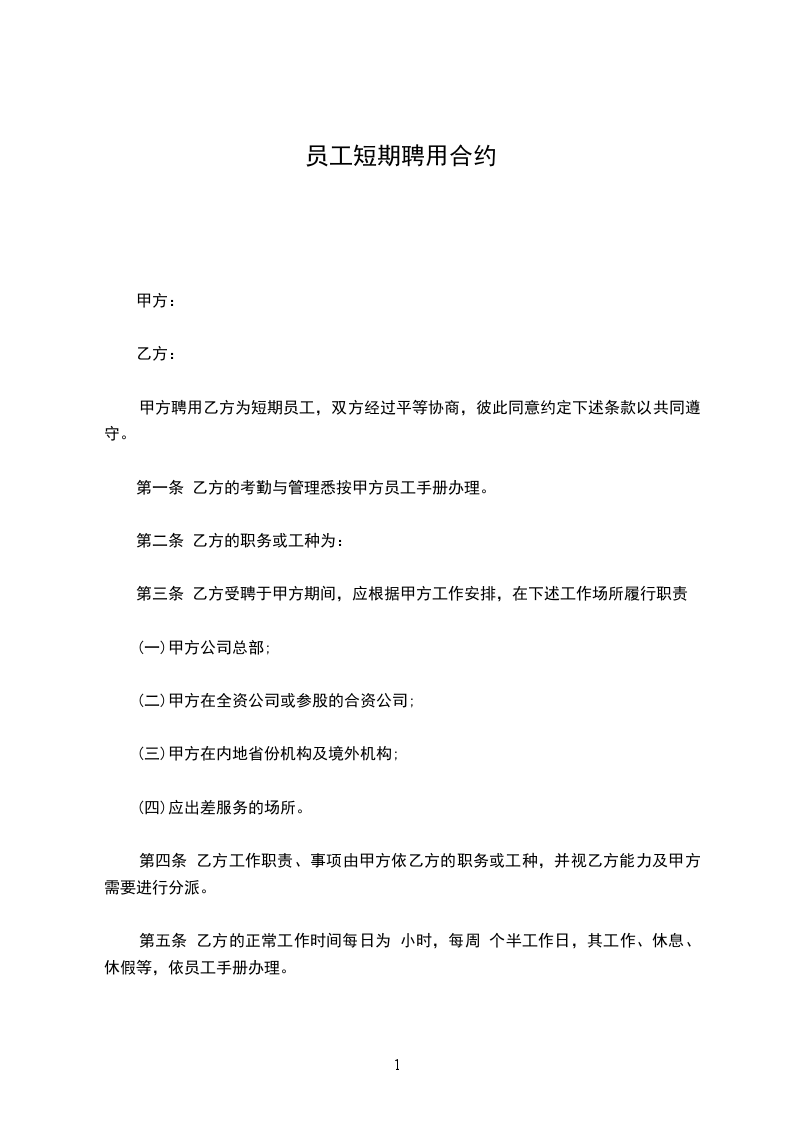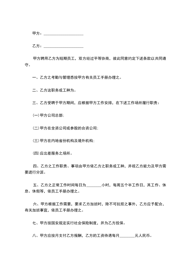 乙方:_________________________________ 甲方聘用乙方为短期员工,双方经过平等协商,彼此同意约定下述条款以共同遵守。