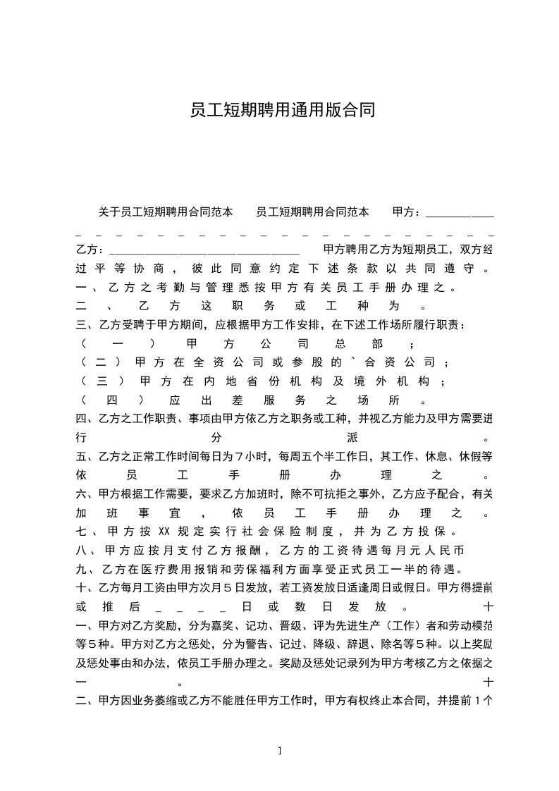 关于员工短期聘用合同范本 员工短期聘用合同范本 甲方:_________________________________