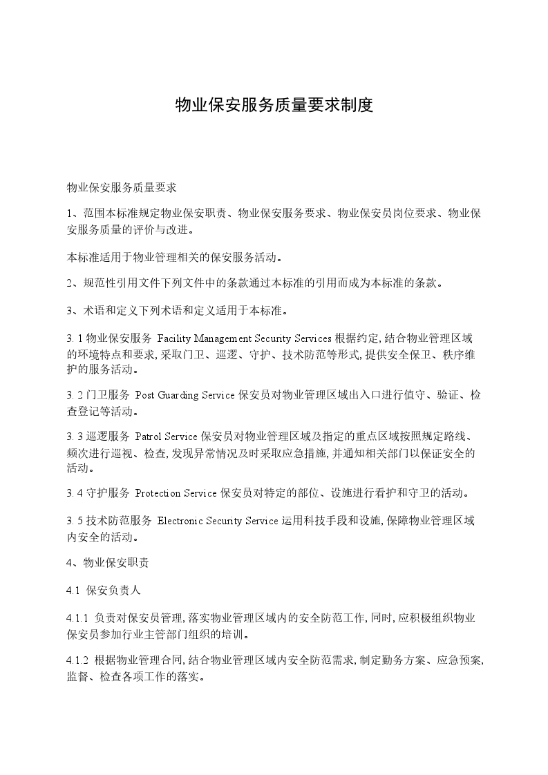 1、范围本标准规定物业保安职责、物业保安服务要求、物业保安员岗位要求、物业保安服务质量的评价与改进。