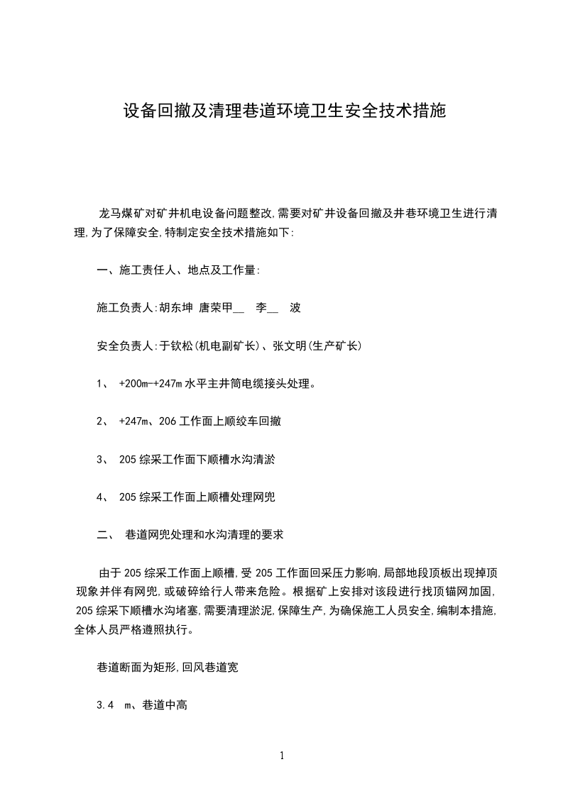龙马煤矿对矿井机电设备问题整改,需要对矿井设备回撤及井巷环境卫生进行清理,为了保障安全,特制定安全技术措施如下: