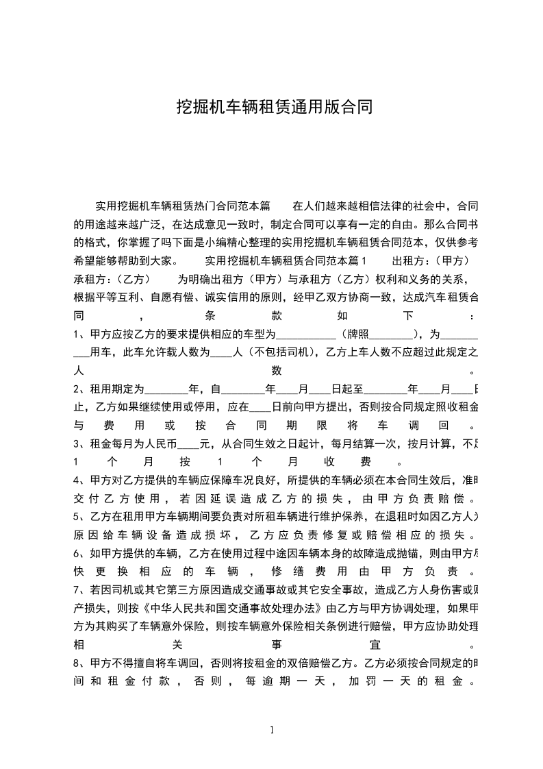 实用挖掘机车辆租赁热门合同范本篇 在人们越来越相信法律的社会中,合同的用途越来越广泛,在达成意见一致时,制定合同可以享有一定的自由。那么合同书的格式,你掌握了吗下面是小编精心整理的实用挖掘机车辆租赁合同范本,仅供参考,希望能够帮助到大家。 实用挖掘机车辆租赁合同范本篇1 出租方:(甲方) 承租方:(乙方) 为明确出租方(甲方)与承租方(乙方)权利和义务的关系,根据平等互利、自愿有偿、诚实信用的原则,经甲乙双方协商一致,达成汽车租赁合同,条款如下:
