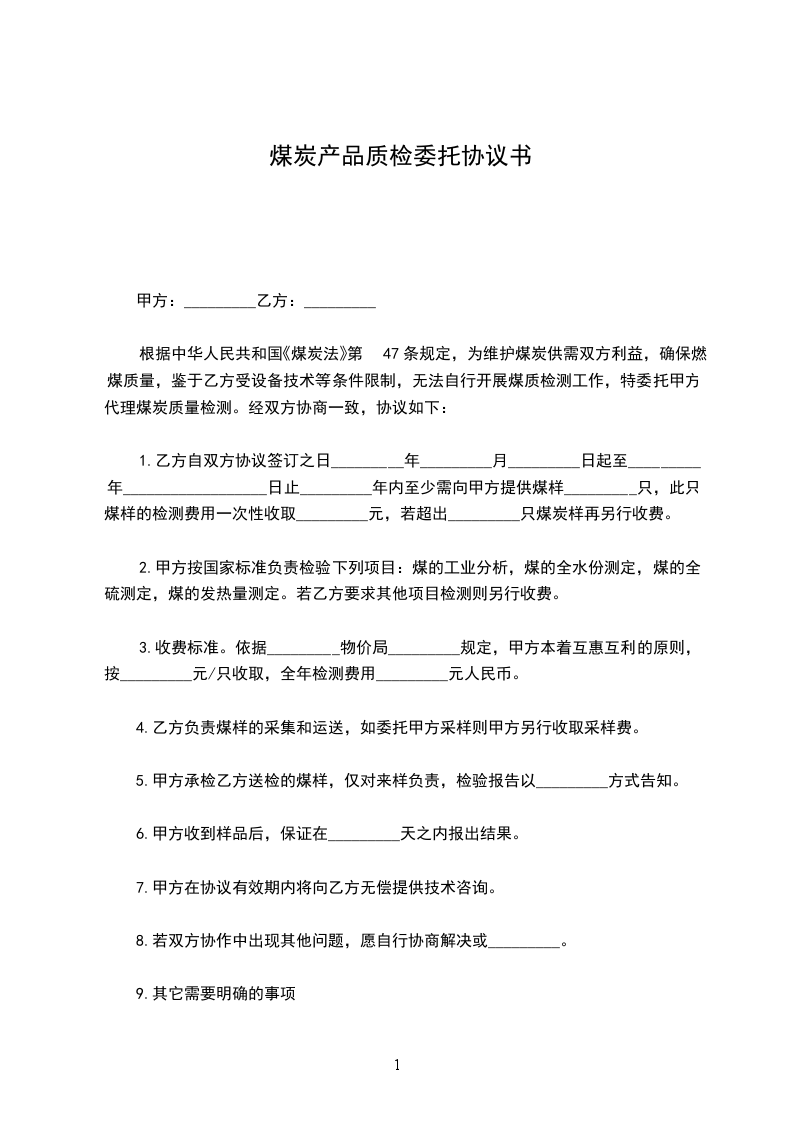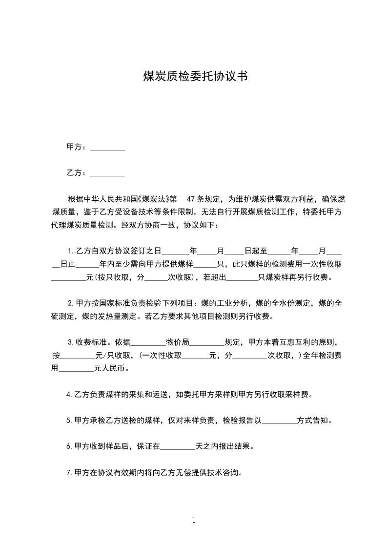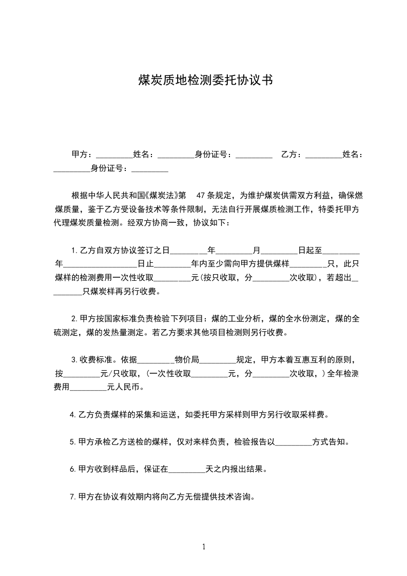 根据中华人民共和国《煤炭法》第47条规定,为维护煤炭供需双方利益,确保燃煤质量,鉴于乙方受设备技术等条件限制,无法自行开展煤质检测工作,特委托甲方代理煤炭质量检测。经双方协商一致,协议如下: