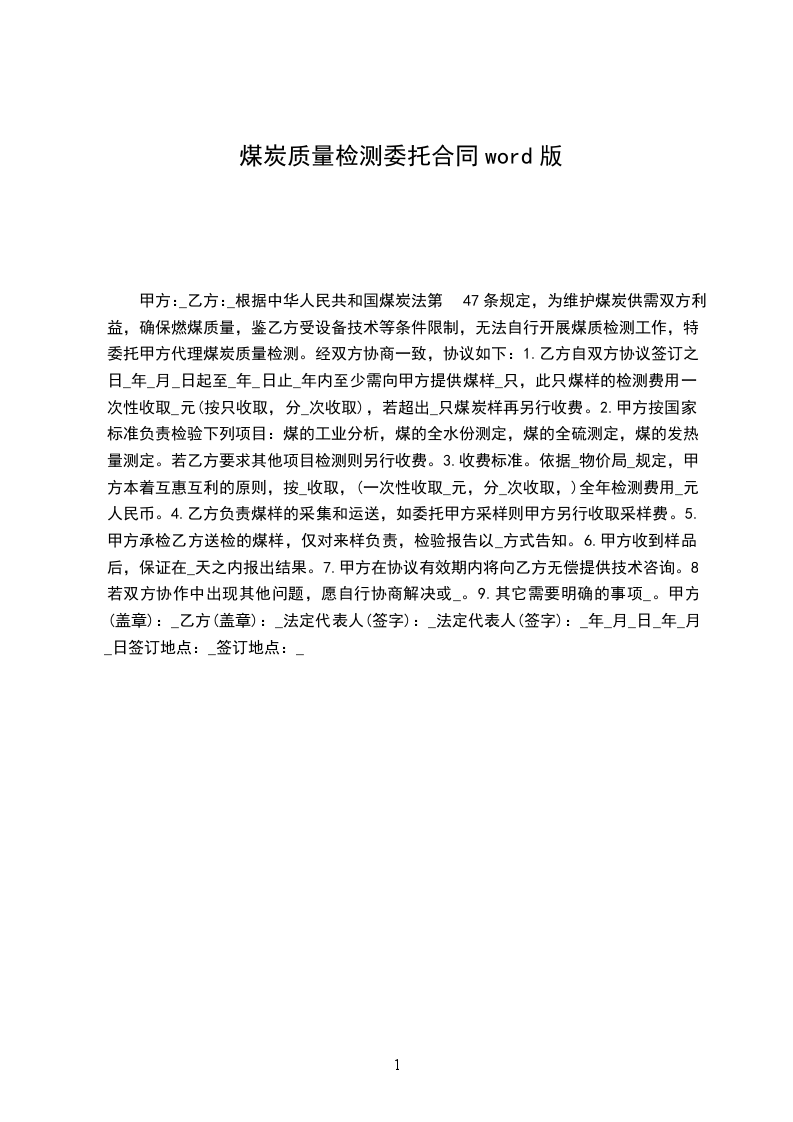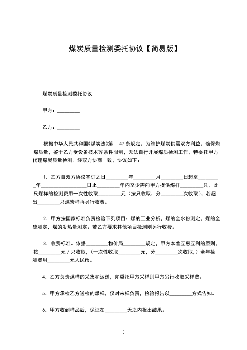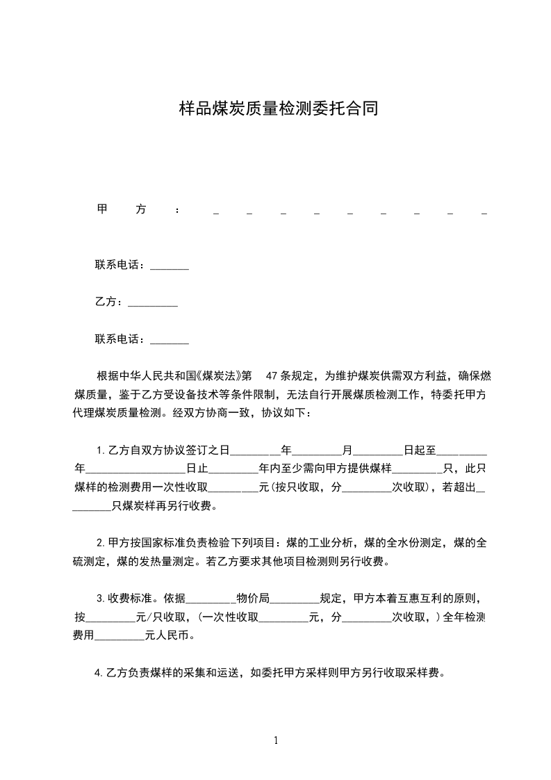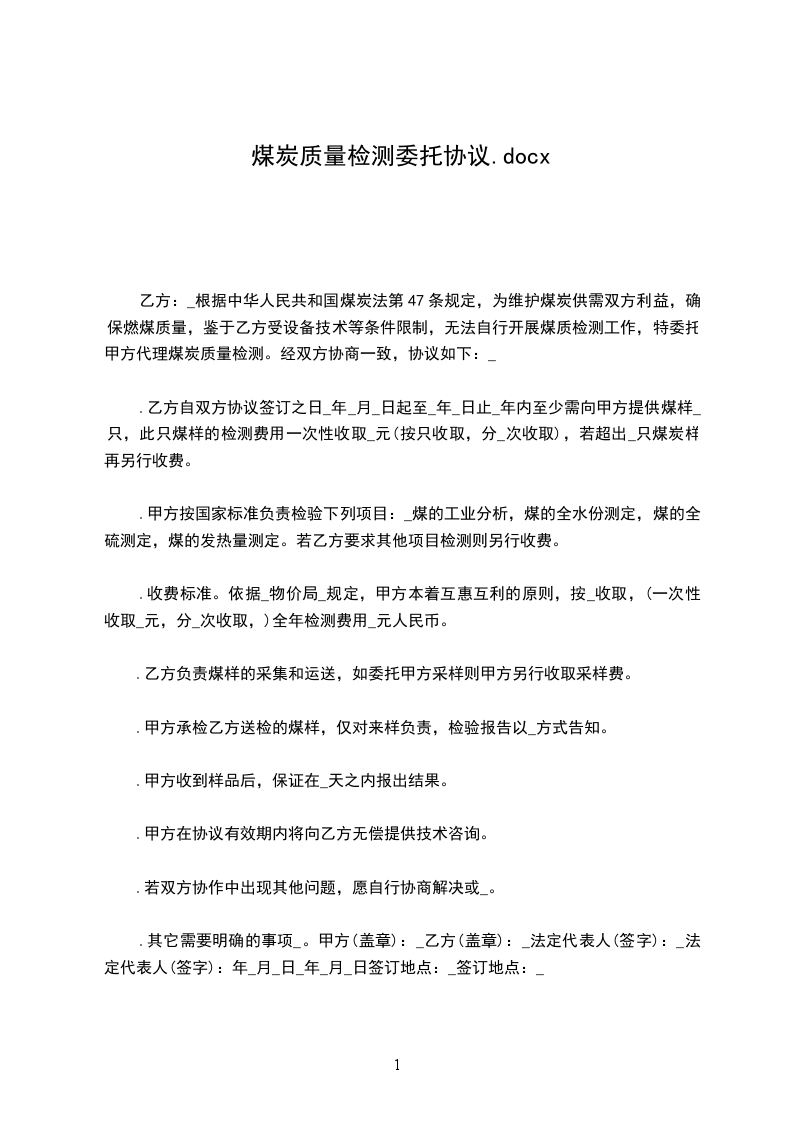 根据中华人民共和国《煤炭法》第47条规定,为维护煤炭供需双方利益,确保燃煤质量,鉴于乙方受设备技术等条件限制,无法自行开展煤质检测工作,特委托甲方代理煤炭质量检测。经双方协商一致,协议如下: