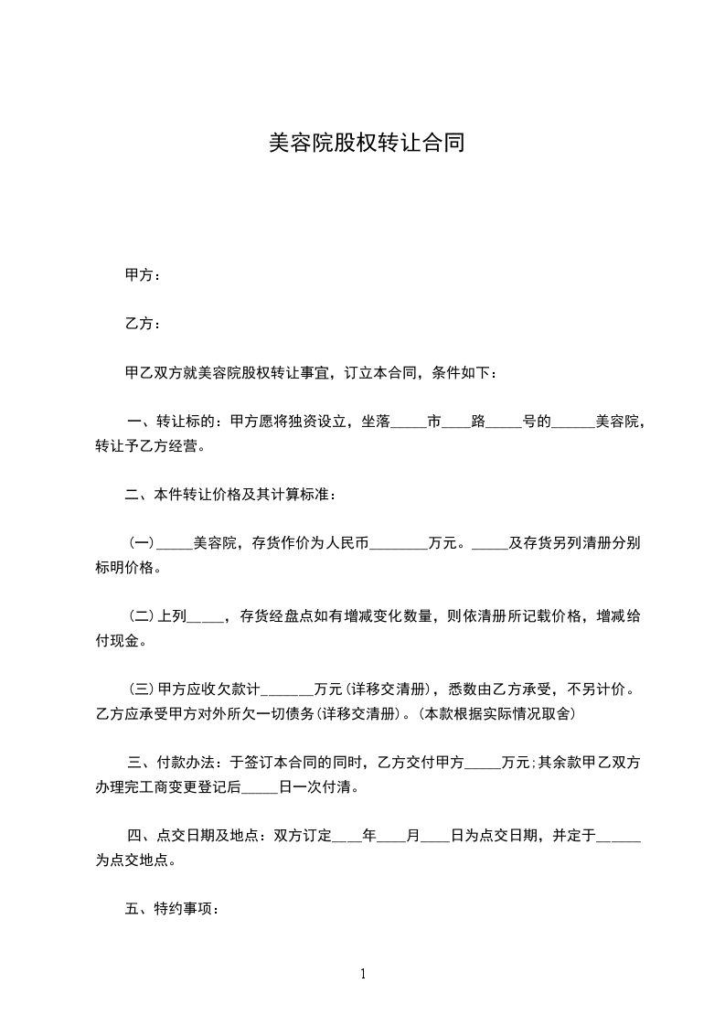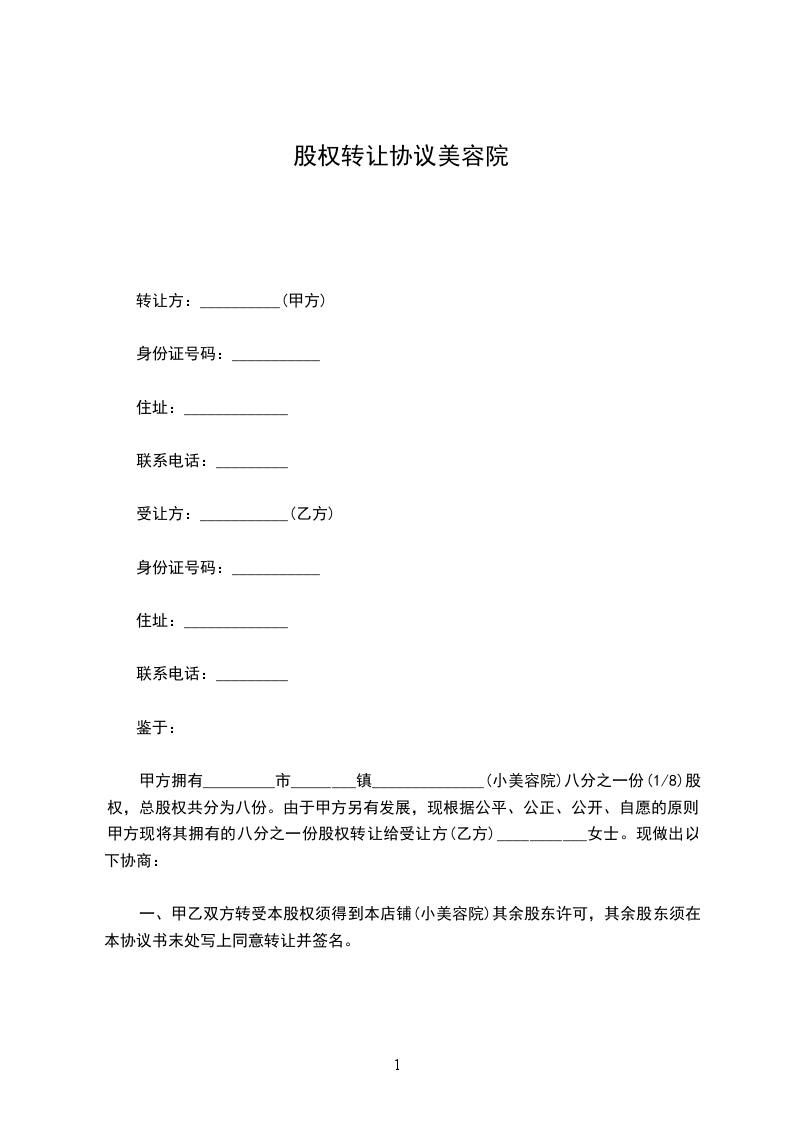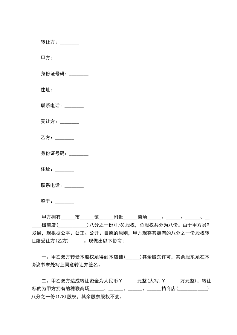 甲方拥有深圳市龙华镇________________附近________________________股权,总股权共分为八份。由于甲方另有发展,现根据公平、公正、公开、自愿的原则,甲方现将其拥有的八分之一份股权转让给受让方(乙方)________。现做出以下协商: