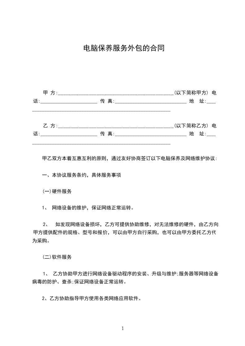 甲乙双方本着互惠互利的原则,通过友好协商签订以下电脑保养及网络维护协议: