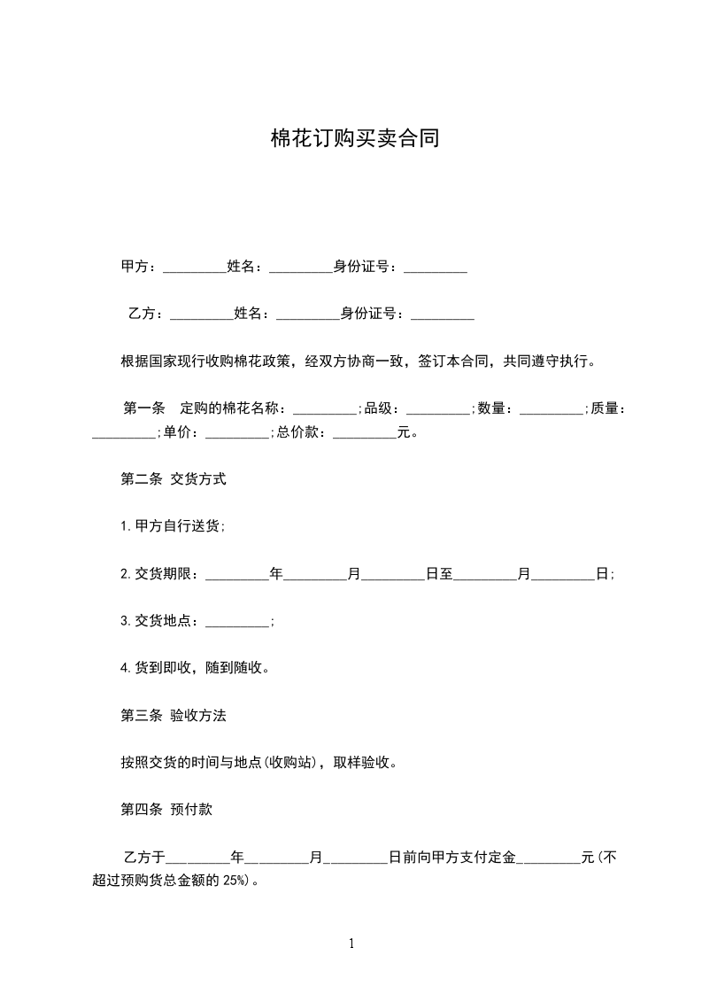 第一条 定购的棉花名称:_________;品级:_________;数量:_________;质量:_________;单价:_________;总价款:_________元。