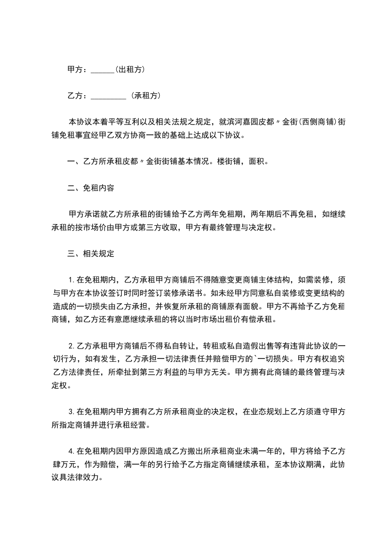 本协议本着平等互利以及相关法规之规定,就滨河嘉园皮都〃金街(西侧商铺)街铺免租事宜经甲乙双方协商一致的基础上达成以下协议。