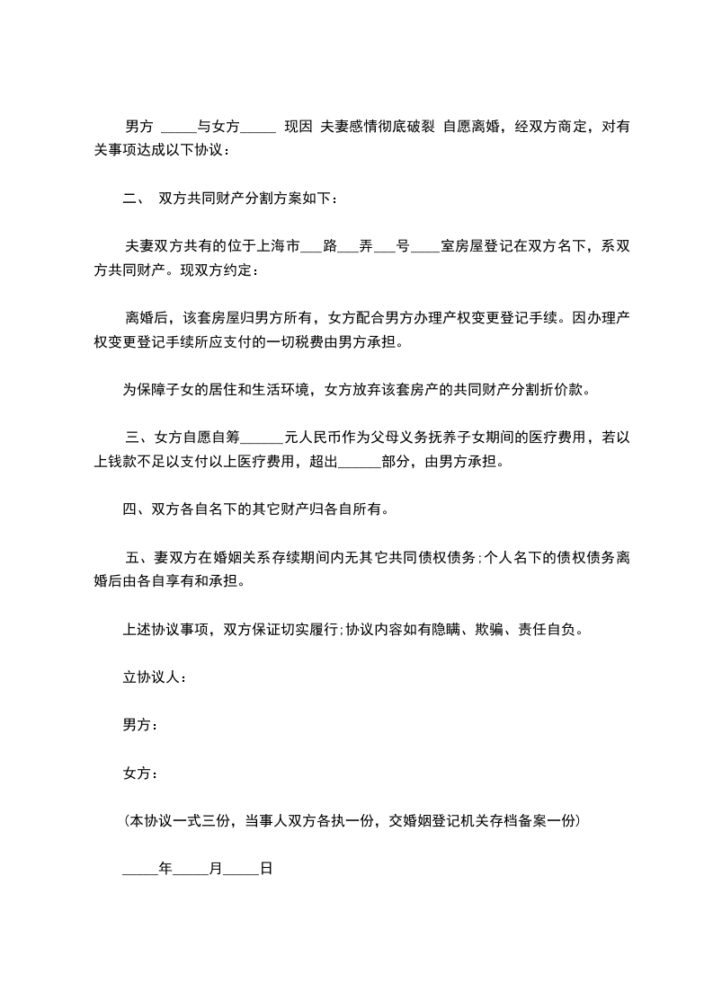男方 _____与女方_____ 现因 夫妻感情彻底破裂 自愿离婚,经双方商定,对有关事项达成以下协议: