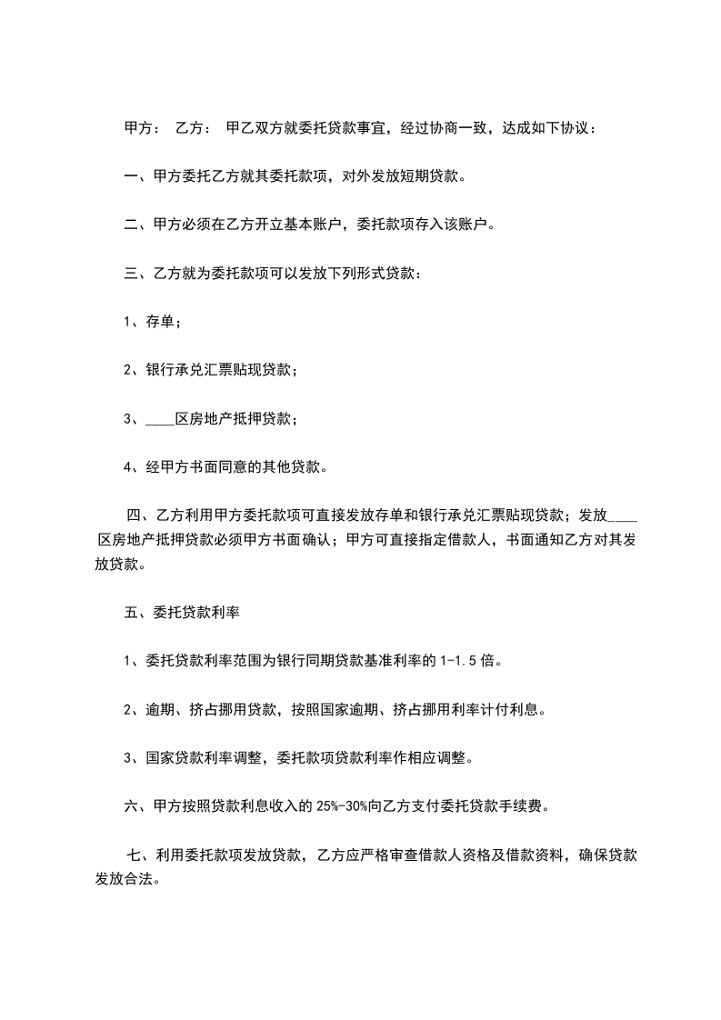 甲方: 乙方: 甲乙双方就委托贷款事宜,经过协商一致,达成如下协议:
