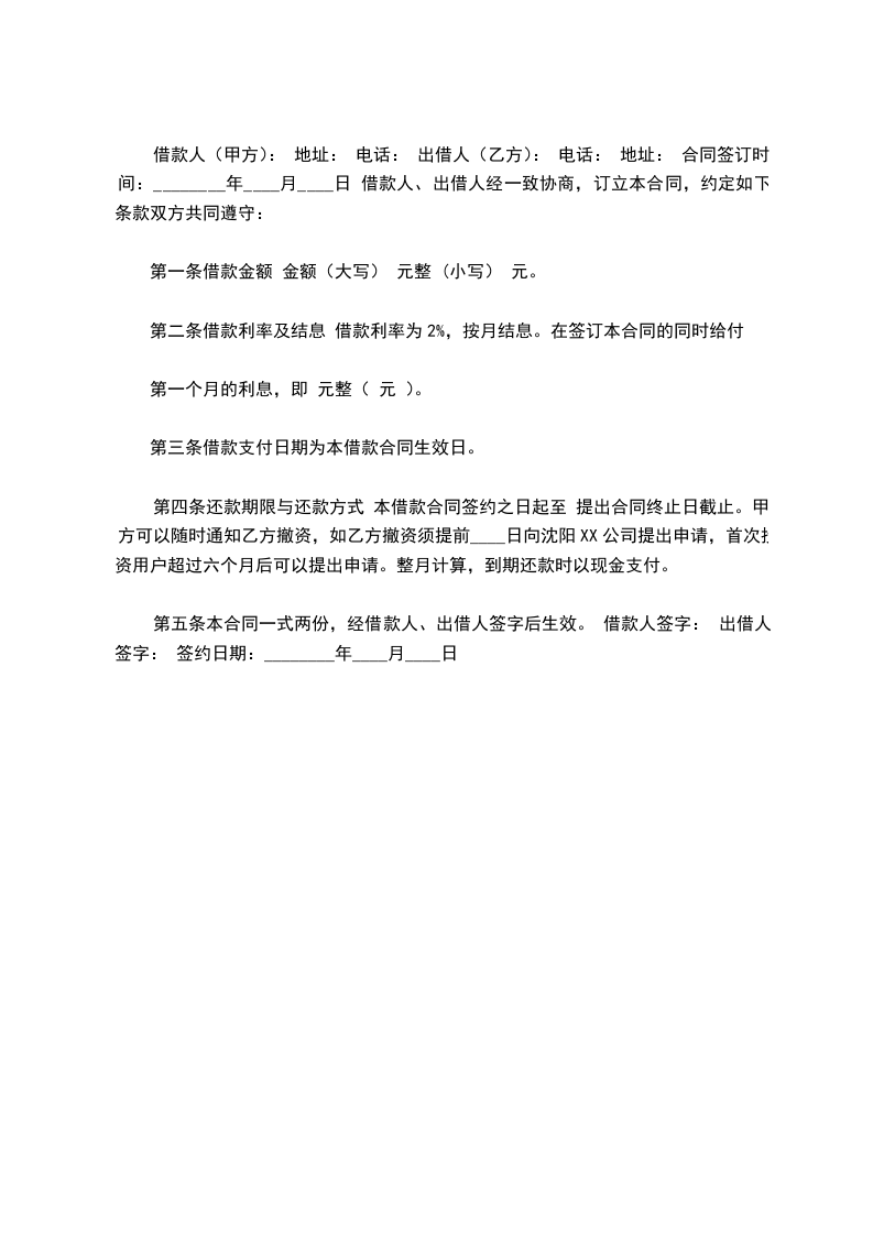 第四条还款期限与还款方式 本借款合同签约之日起至 提出合同终止日截止。甲方可以随时通知乙方撤资,如乙方撤资须提前____日向沈阳XX公司提出申请,首次投资用户超过六个月后可以提出申请。整月计算,到期还款时以现金支付。