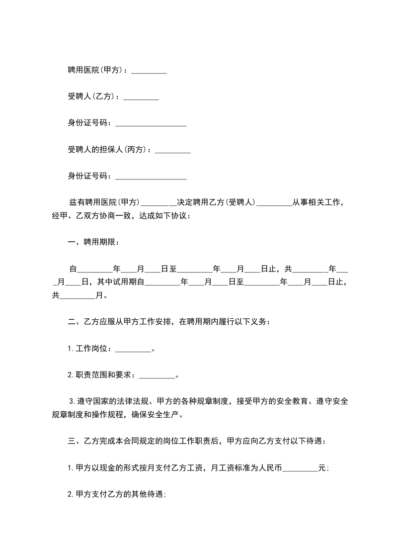 兹有聘用医院(甲方)_________决定聘用乙方(受聘人)_________从事相关工作,经甲、乙双方协商一致,达成如下协议: