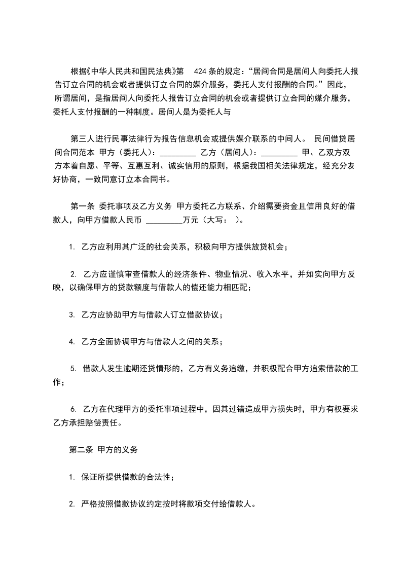 第三人进行民事法律行为报告信息机会或提供媒介联系的中间人。 民间借贷居间合同范本 甲方(委托人):_________ 乙方(居间人):_________ 甲、乙双方双方本着自愿、平等、互惠互利、诚实信用的原则,根据我国相关法律规定,经充分友好协商,一致同意订立本合同书。