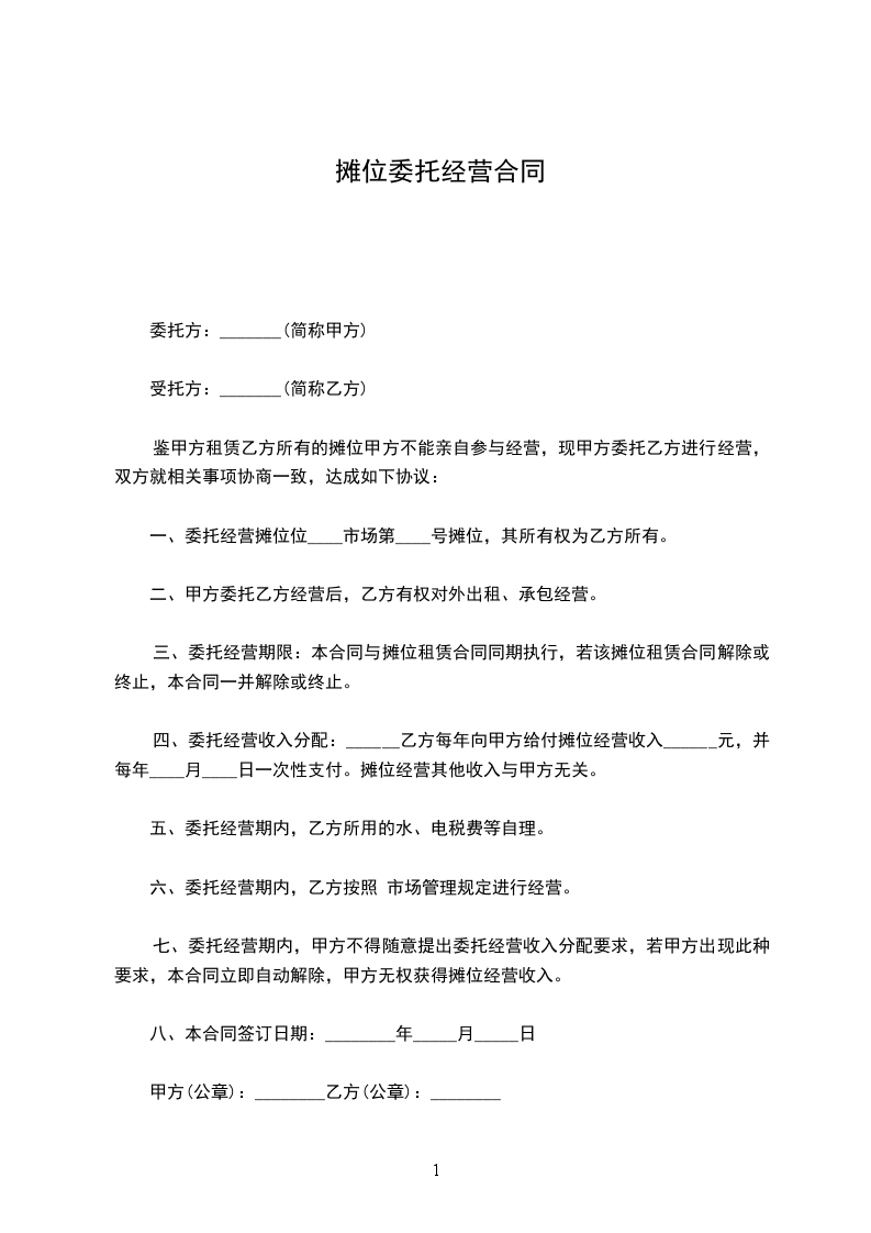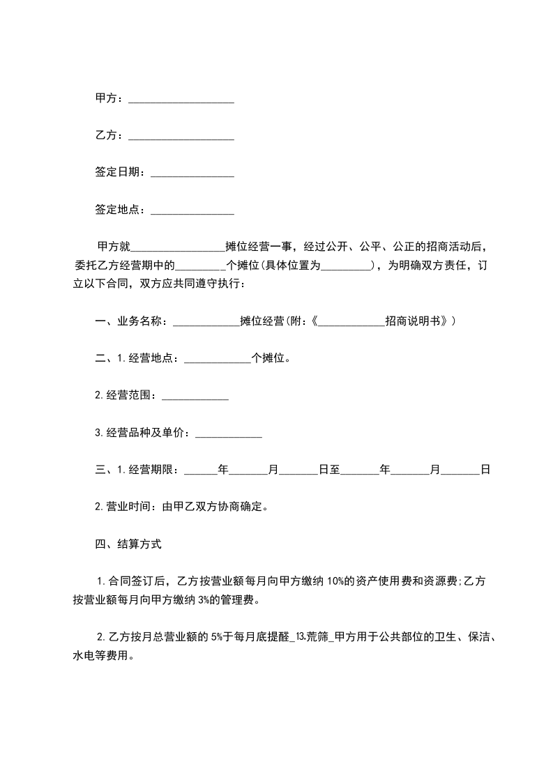 甲方就_________________摊位经营一事,经过公开、公平、公正的招商活动后,委托乙方经营期中的_________个摊位(具体位置为_________),为明确双方责任,订立以下合同,双方应共同遵守执行: