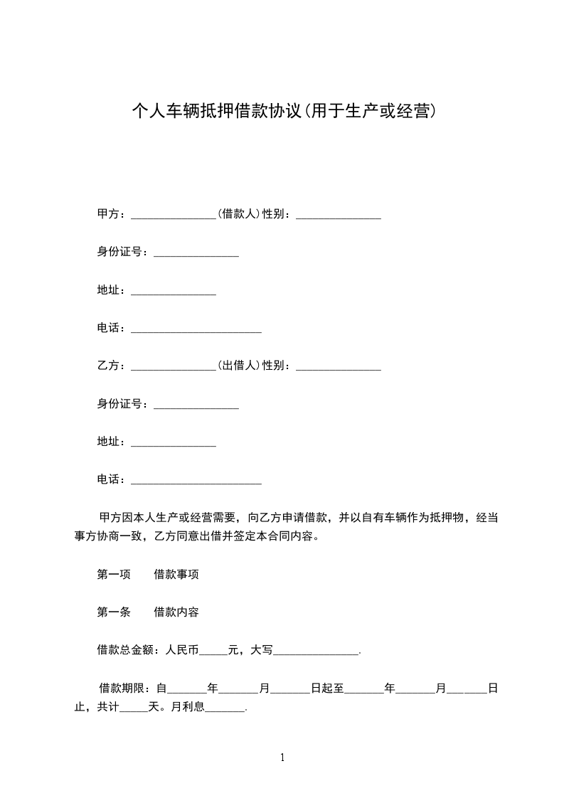甲方因本人生产或经营需要,向乙方申请借款,并以自有车辆作为抵押物,经当事方协商一致,乙方同意出借并签定本合同内容。