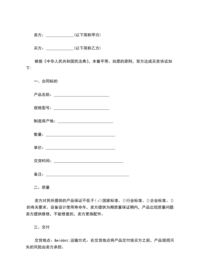 第六条 买卖价款议定为人民币______元整,于合同成立同时由乙方缴付保证金人民币______元整。