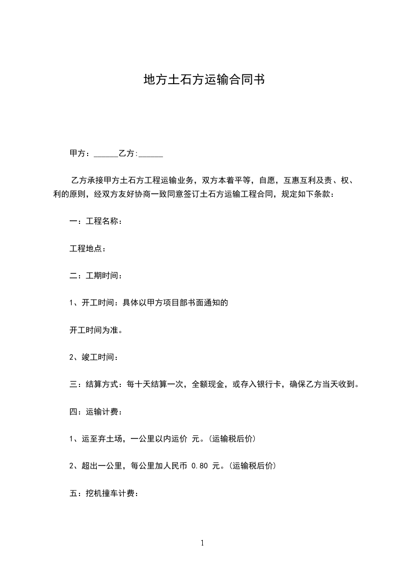 乙方承接甲方土石方工程运输业务,双方本着平等,自愿,互惠互利及责、权、利的原则,经双方友好协商一致同意签订土石方运输工程合同,规定如下条款: