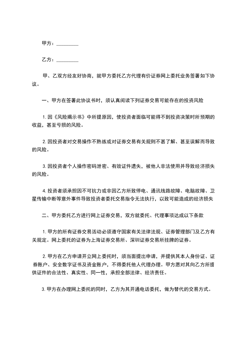 二、甲方委托乙方进行网上证券交易,双方就委托、代理事项达成以下条款