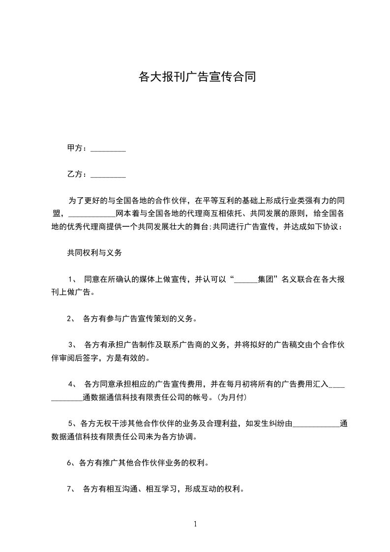 1、 同意在所确认的媒体上做宣传,并认可以“______集团”名义联合在各大报刊上做广告。