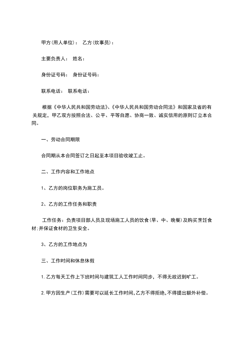 甲方(用人单位): 乙方(炊事员):