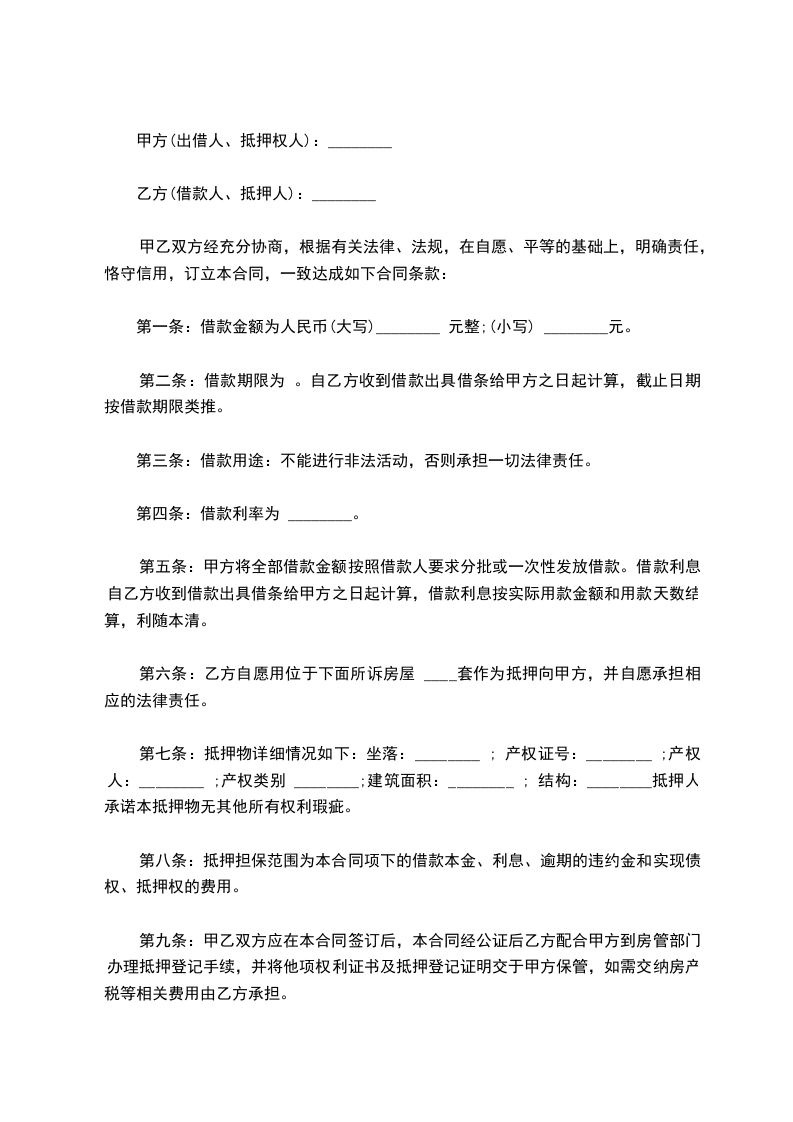 第六条:乙方自愿用位于下面所诉房屋 ____套作为抵押向甲方,并自愿承担相应的法律责任。