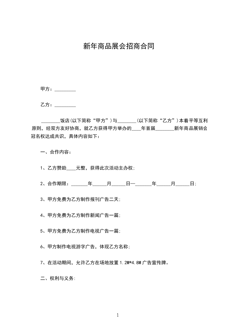 ________饭店(以下简称“甲方”)与________(以下简称“乙方”)本着平等互利原则,经双方友好协商,就乙方获得甲方举办的____年首届________新年商品展销会冠名权达成共识,具体内容如下: