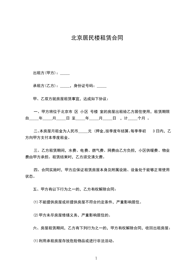 一、甲方将位于北京市 区 小区 号楼 室的房屋出租给乙方居住使用,租赁期限自_____年_____月_____日 至_____年_____月_____日 ,计_____个月 。