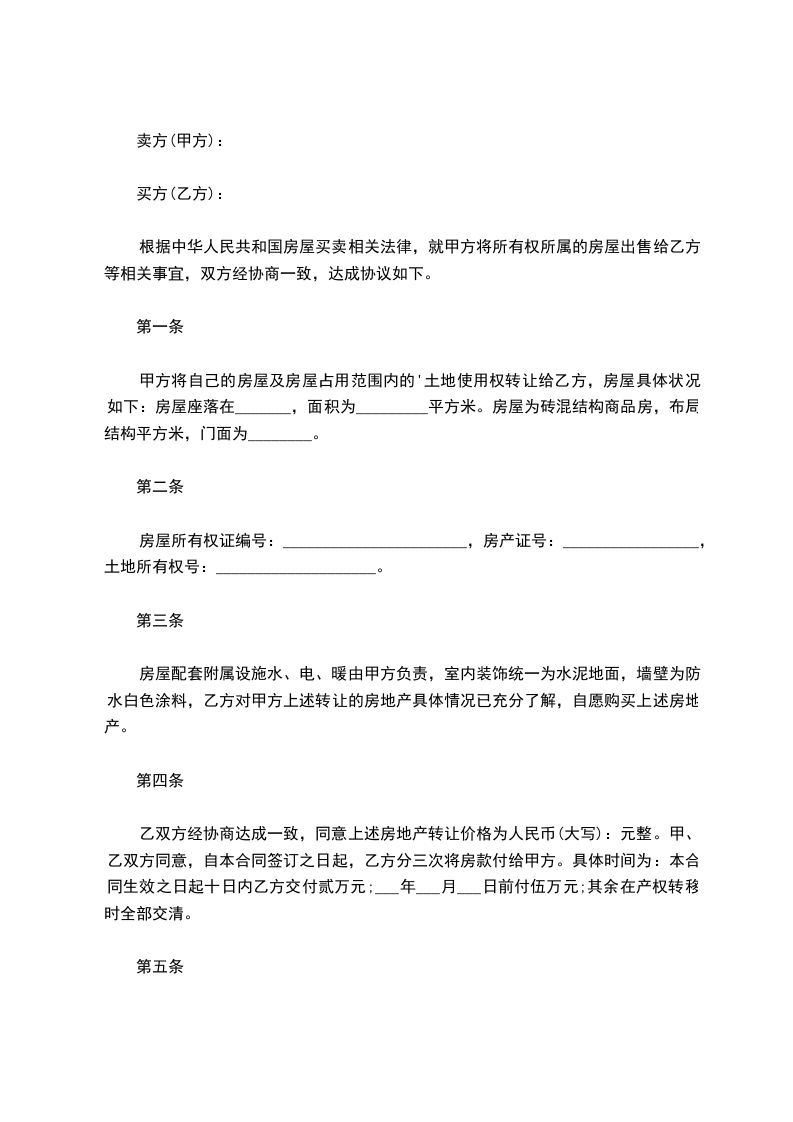 甲方将自己的房屋及房屋占用范围内的'土地使用权转让给乙方,房屋具体状况如下:房屋座落在_______,面积为_________平方米。房屋为砖混结构商品房,布局结构平方米,门面为________。