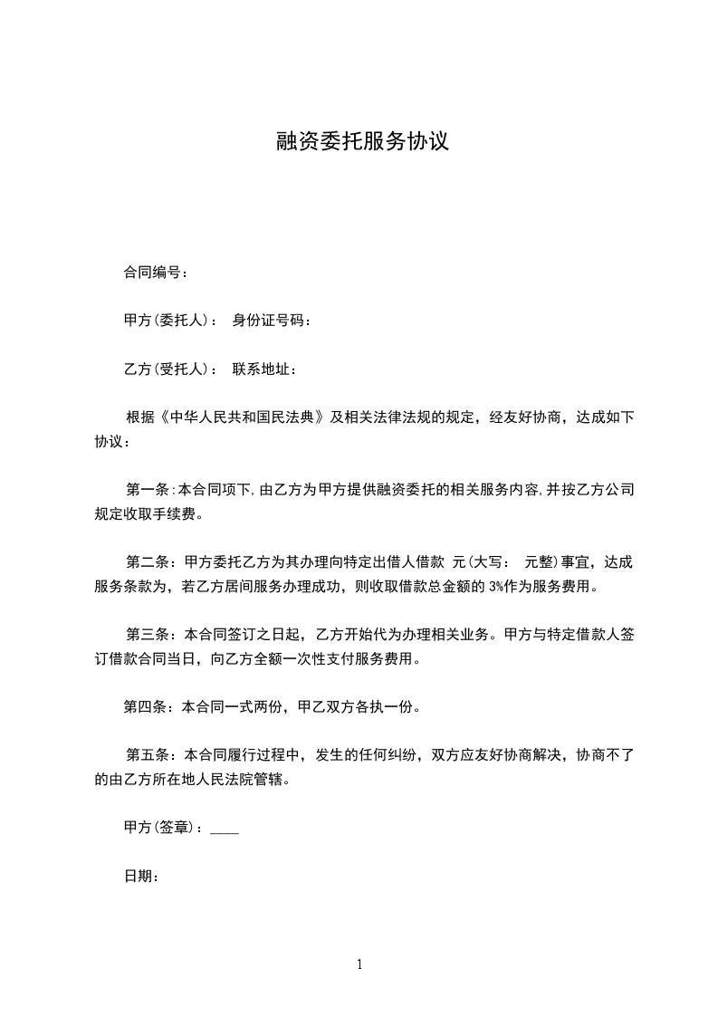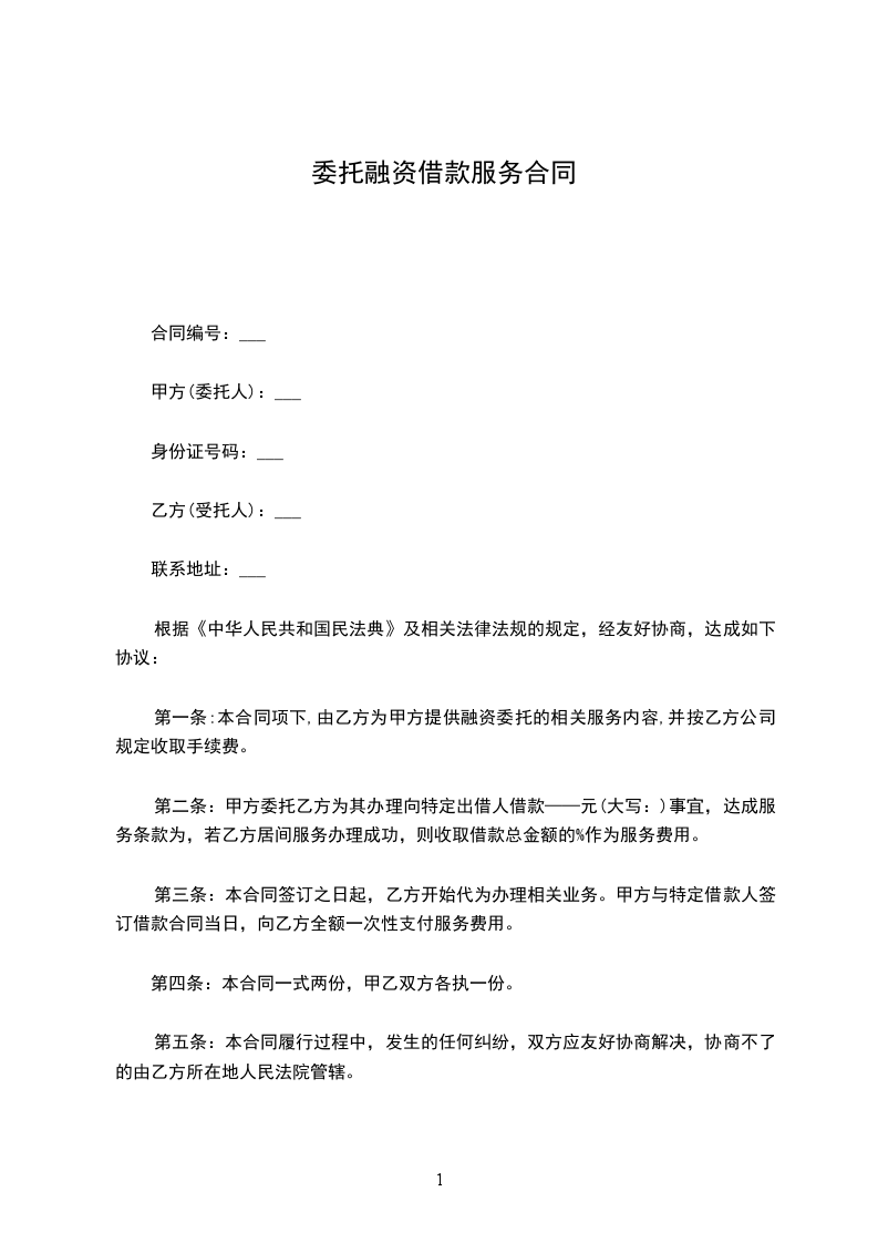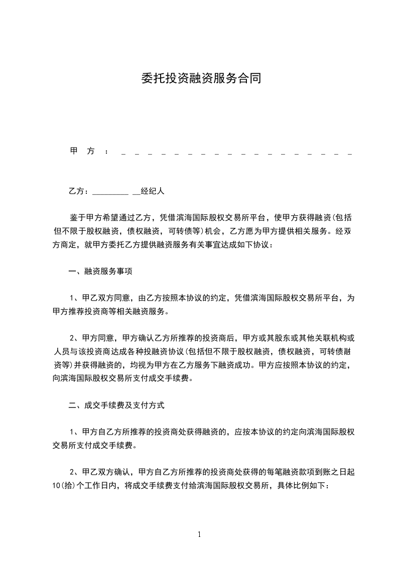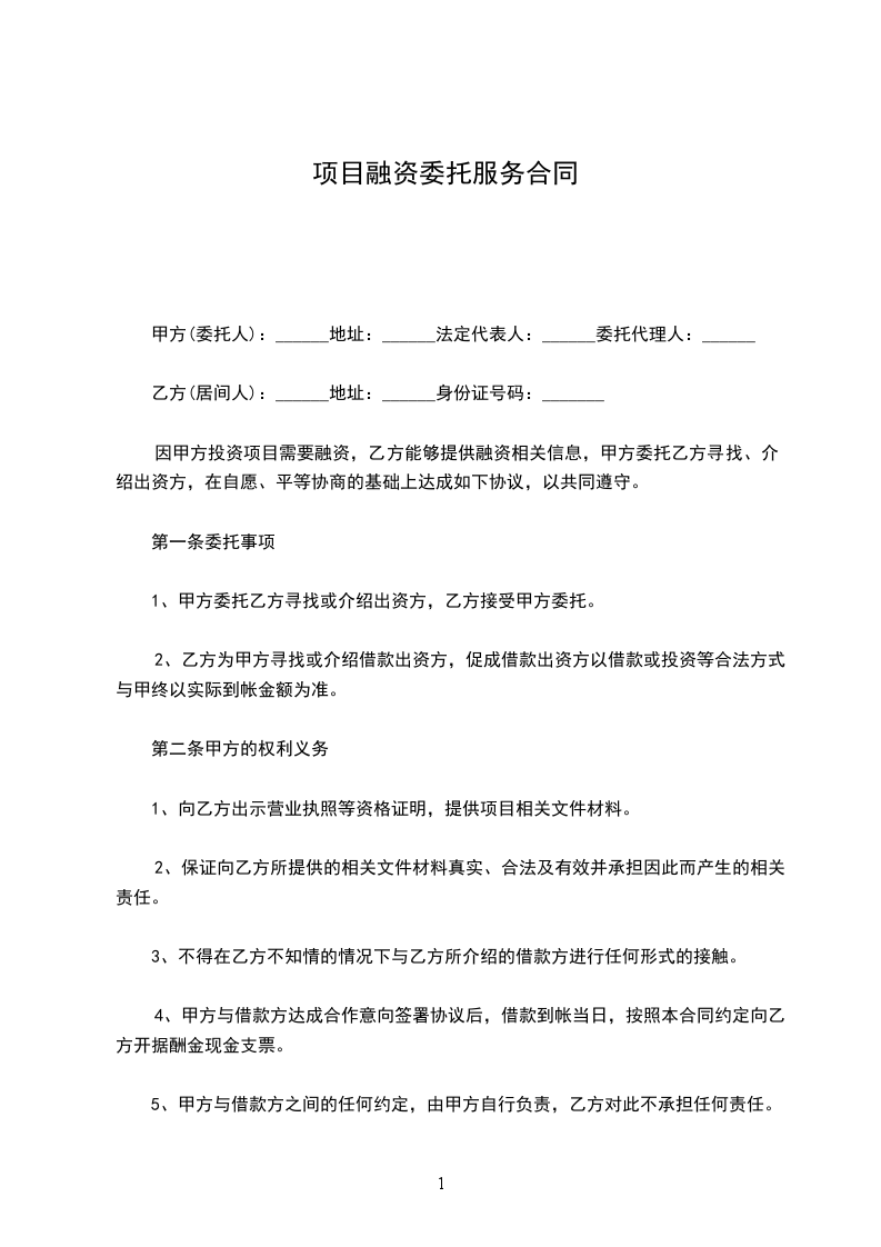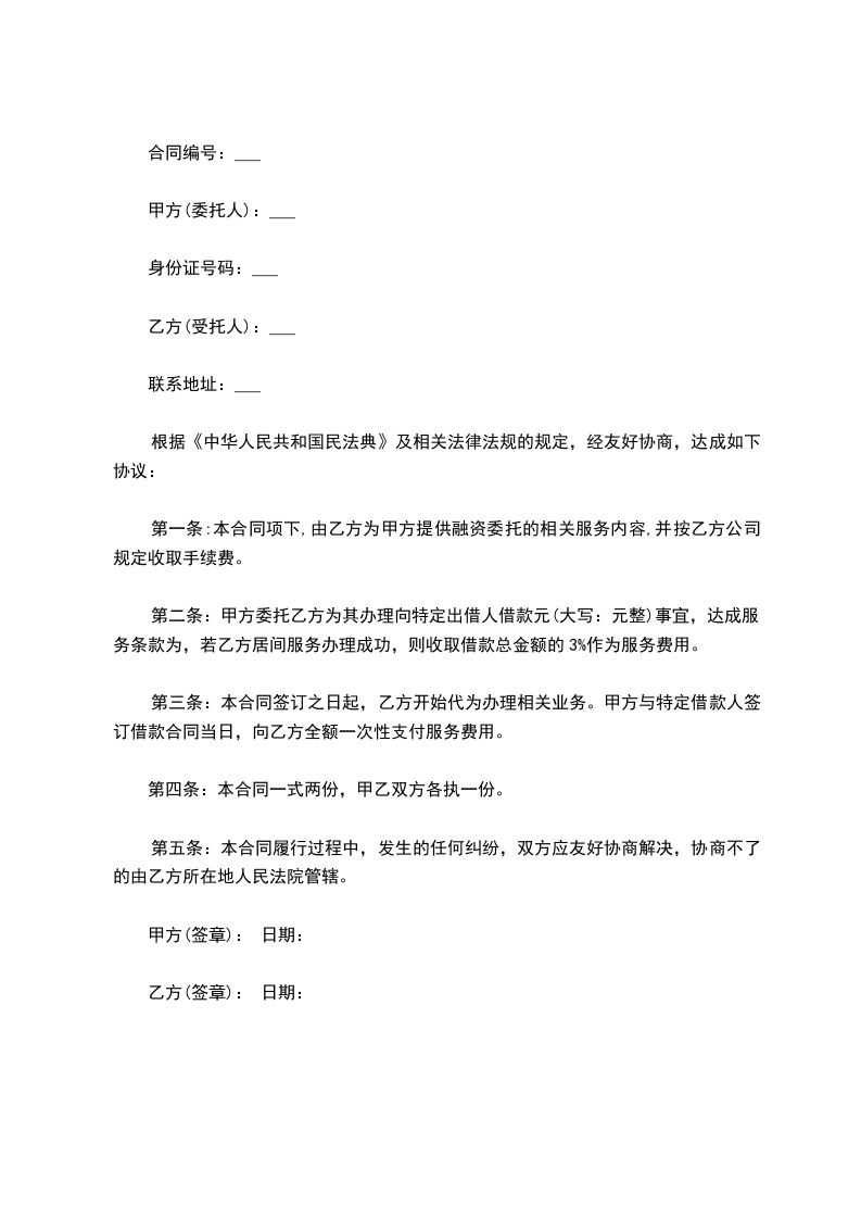 一、委托事项:甲方因________需要,意向融资借款人民币大写_________元,为实现融资,甲方委托乙方的服务事项包括: