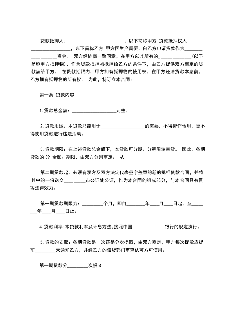 贷款抵押人:________________________,以下简称甲方 贷款抵押权人:______________________,以下简称乙方 甲方因生产需要,向乙方申请贷款作为___________________资金。 双方经协商一致同意,在甲方以其所有的______________(以下简称甲方抵押物),作为贷款抵押物抵押给乙方的条件下,由乙方提供双方商定的贷款额给甲方。 在贷款期限内,甲方拥有抵押物的使用权,在甲方还清贷款本息前,乙方拥有抵押物的所有权。 为此,特订立本合同:
