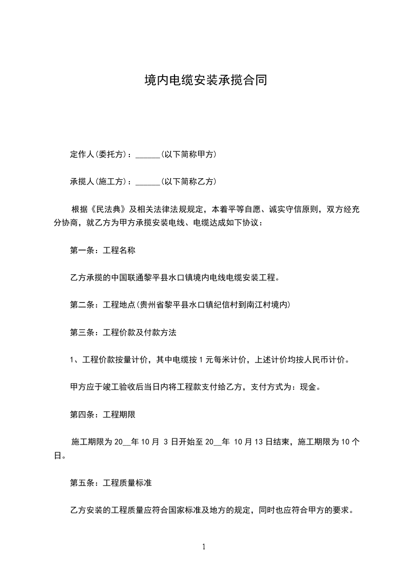 根据《中华人民共和国民法典》及相关法律法规规定,本着平等自愿、诚实守信原则,双方经充分协商,就乙方为甲方承揽安装电线、电缆达成如下协议: