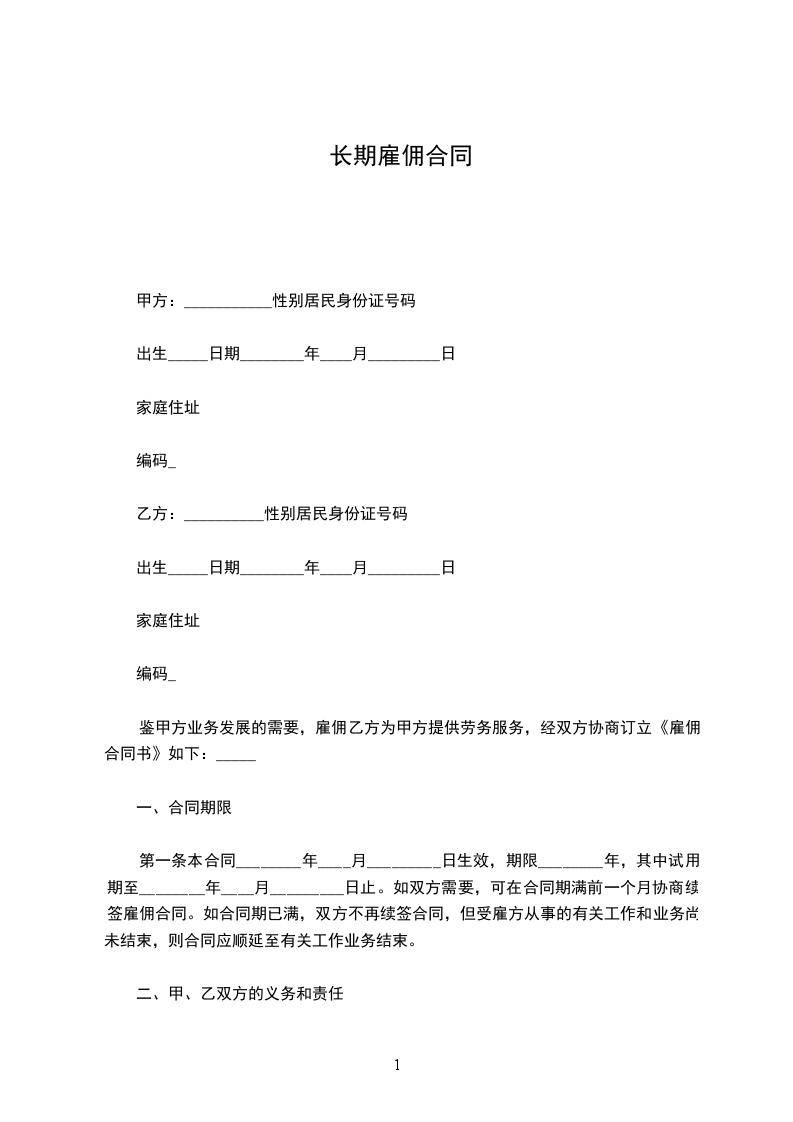 第一条 本合同于________年____月____日生效,期限________年,其中试用期至________年____月____日止。如双方需要,可在合同期满前一个月协商续签雇佣合同。如合同期已满,双方不再续签合同,但受雇方从事的有关工作和业务尚未结束,则合同应顺延至有关工作业务结束。