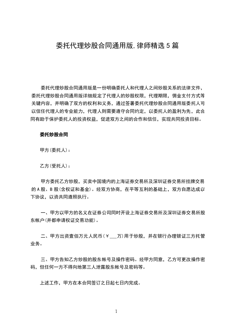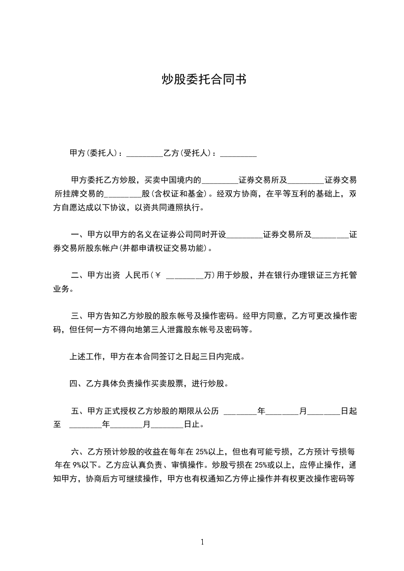 甲方委托乙方炒股,买卖中国境内的_________证券交易所及_________证券交易所挂牌交易的_________股(含权证和基金)。经双方协商,在平等互利的基础上,双方自愿达成以下协议,以资共同遵照执行。