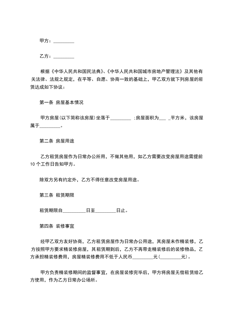经甲乙双方友好协商,乙方租赁房屋作为日常办公用途,其房屋未作精装修,乙方按照甲方要求精装修房屋,其租赁期到后,乙方不再带走精装修后的装修物品,乙方承担精装修费用,房屋精装修费用不低于人民币_________元(_________元)。