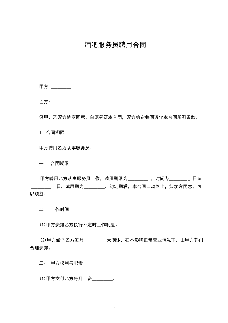 甲方聘用乙方从事服务员工作,聘用期限为_________ ,时间为_________ 日至_________ 日。试用期为_________。约定期满,本合同自动终止,如双方同意,可以续签。