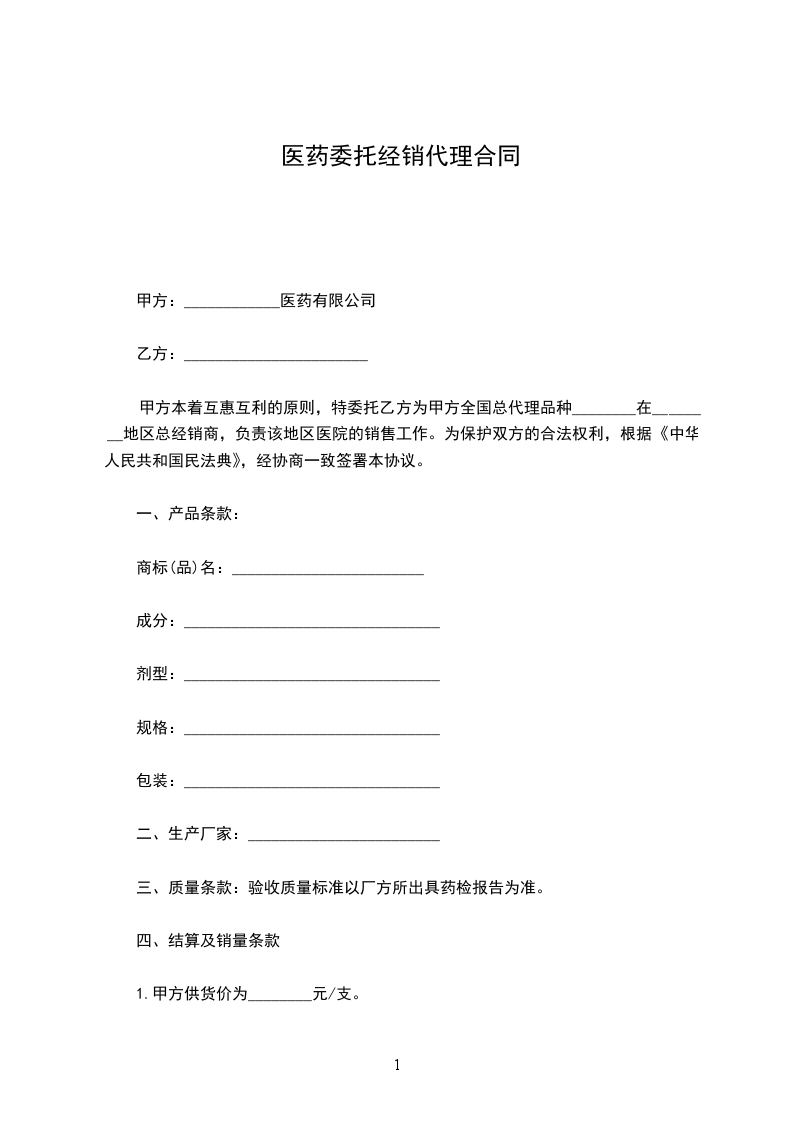 甲方本着互惠互利的原则,特委托乙方为甲方全国总代理品种________在________地区总经销商,负责该地区医院的销售工作。为保护双方的合法权利,根据《中华人民共和国民法典》,经协商一致签署本协议。