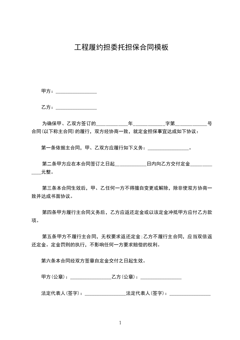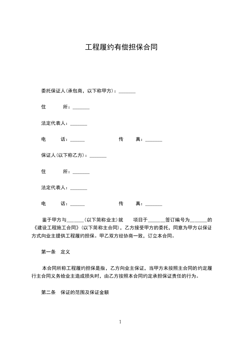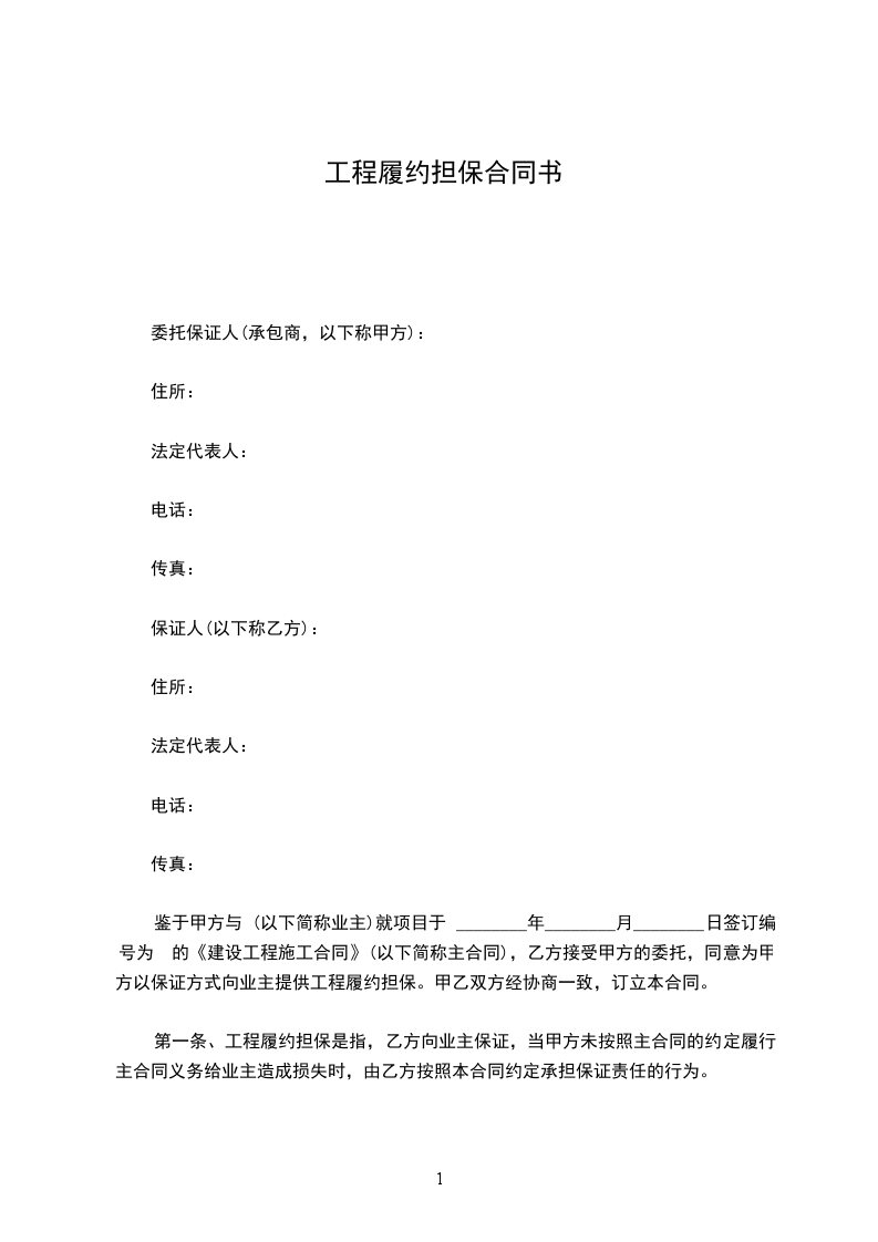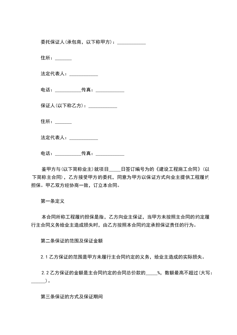 鉴于甲方与 (以下简称业主)就项目于 ________年________月________日签订编号为 的《建设工程施工合同》(以下简称主合同),乙方接受甲方的委托,同意为甲方以保证方式向业主提供工程履约担保。甲乙双方经协商一致,订立本合同。