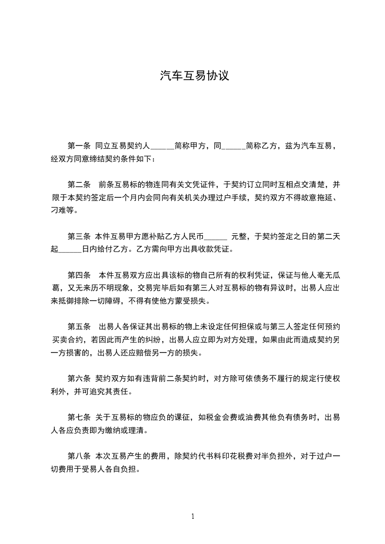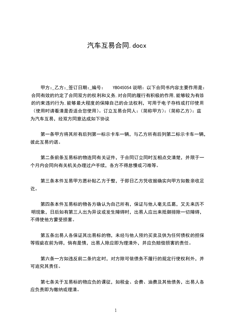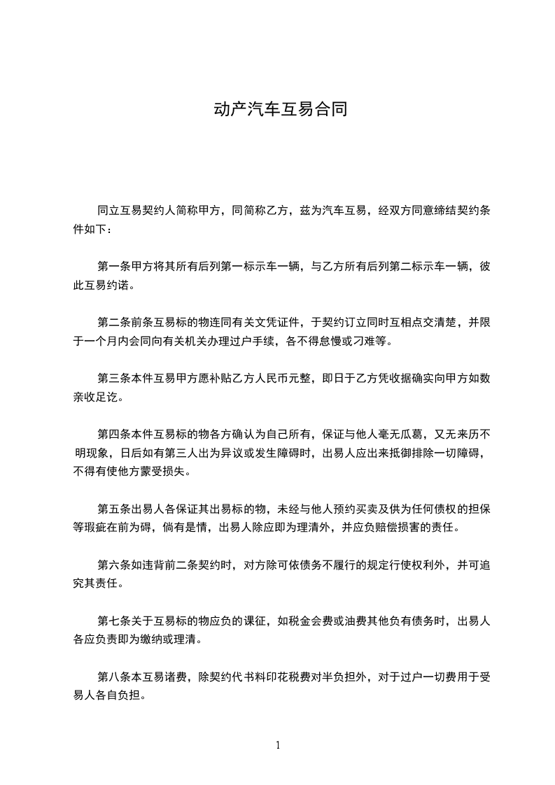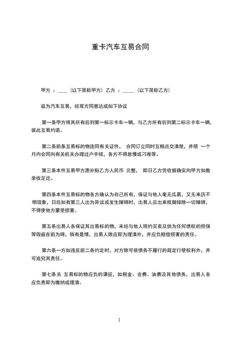 第一条 甲方将其所有后列第一标示卡车一辆,与乙方所有后列第二标示卡车一辆,彼此互易约诺。